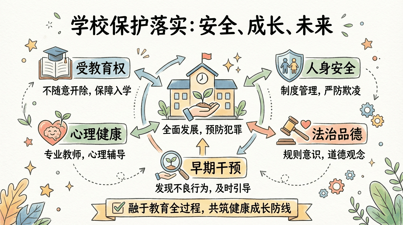 学校是未成年人学习知识、塑造品格的重要场所。学校保护不仅要保障学生的人身安全,更要促进学生的全面发展,预防学生走上违法犯罪道路。落实学校保护,就是要把保护要求融入教育教学的全过程。