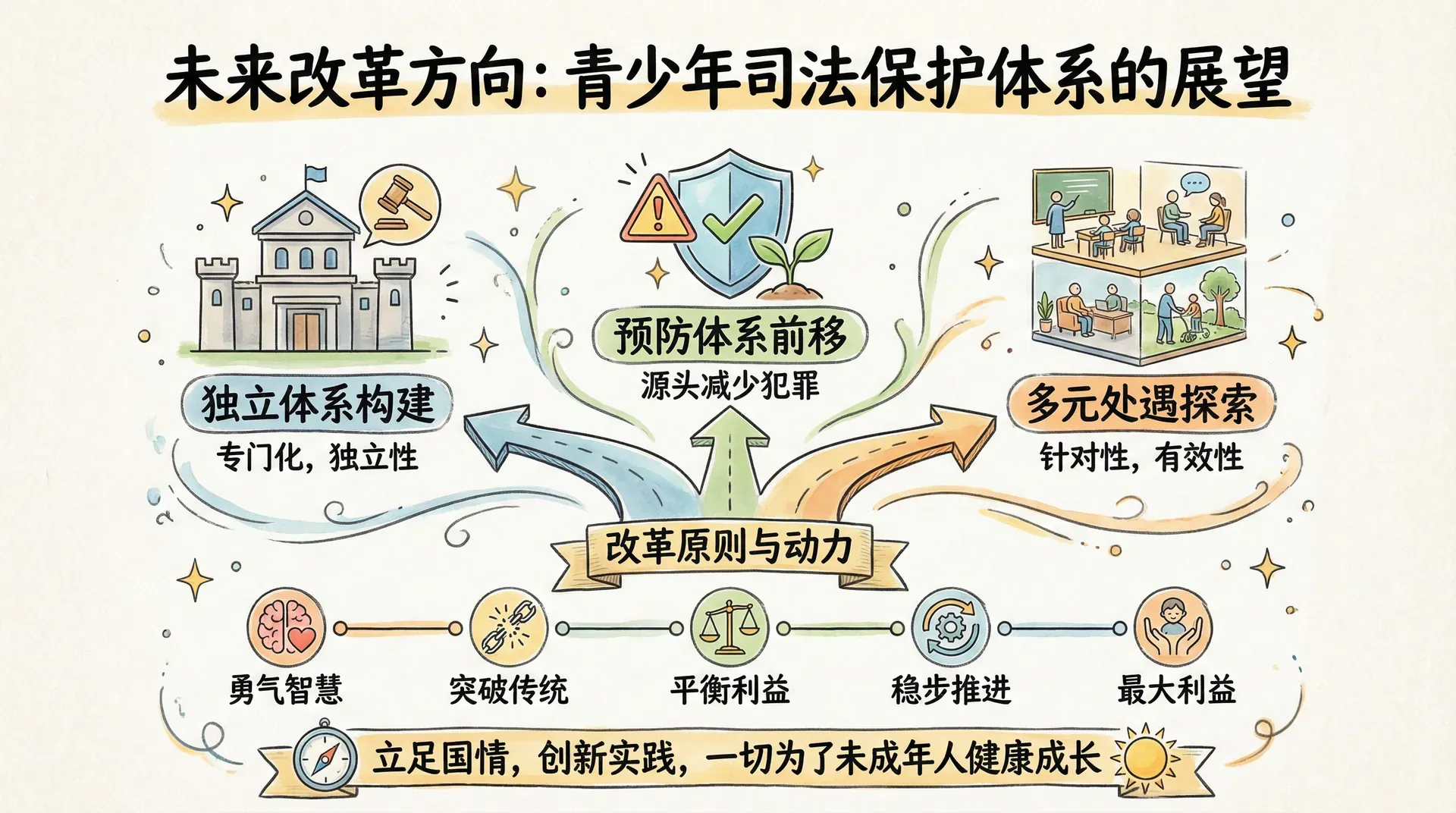 未来的改革要在独立性、预防性、多元性方面不断探索,建立更加科学、更加人性、更加有效的青少年司法保护体系,让每一个孩子都能在法律的保护下健康成长。