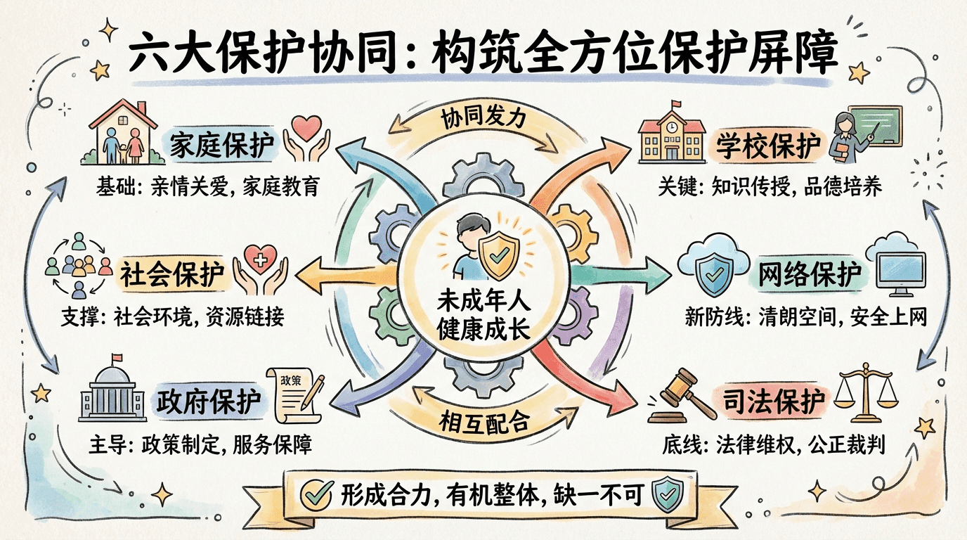 六大保护不是各自为战,而是一个有机整体。家庭是基础,学校是关键,社会是支撑,网络是重点,政府是主导,司法是保障。只有六大保护协同发力、形成合力,才能真正构筑起全方位、立体化的未成年人保护体系。