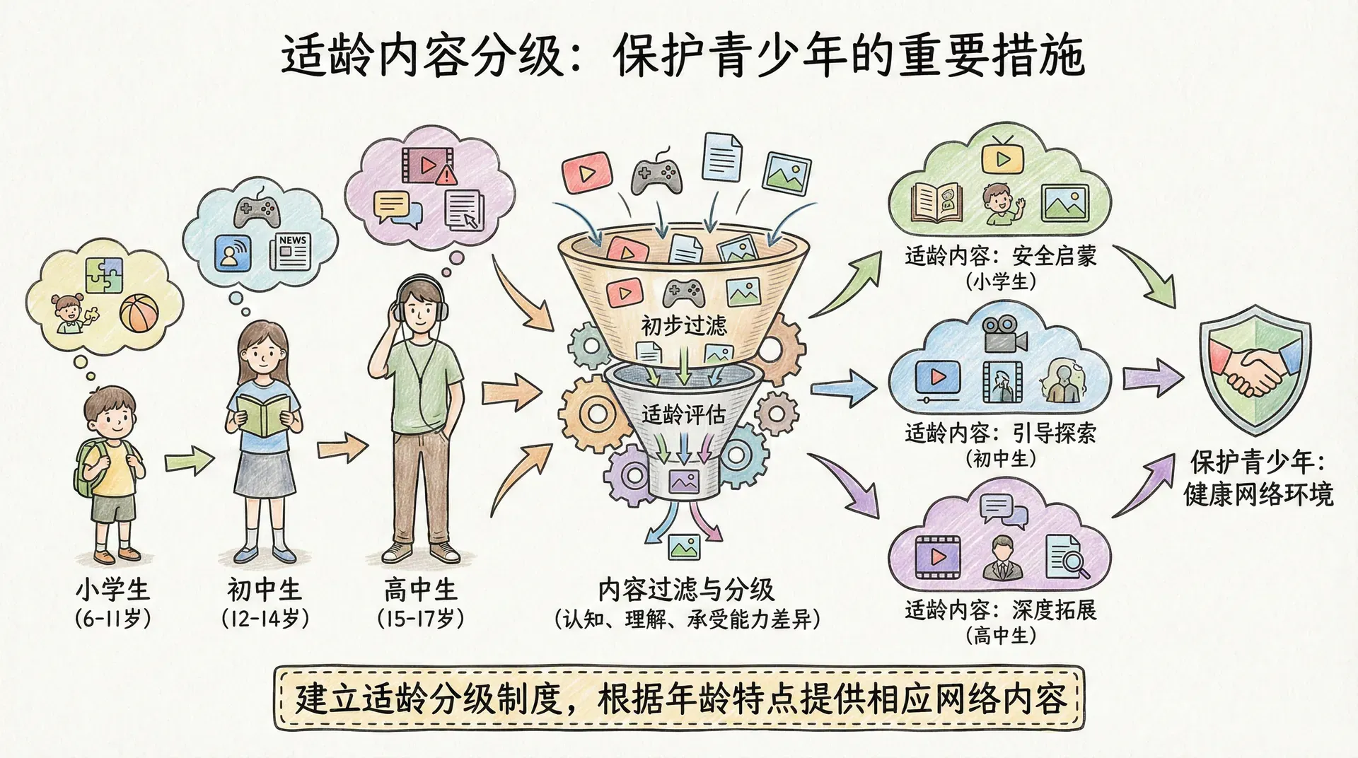 不同年龄段的青少年认知能力、理解能力、承受能力存在显著差异。同样的网络内容,对于高中生可能是合适的,但对于小学生可能就不合适。建立适龄内容分级制度,根据青少年的年龄特点提供相应的网络内容,是保护青少年的重要措施。
