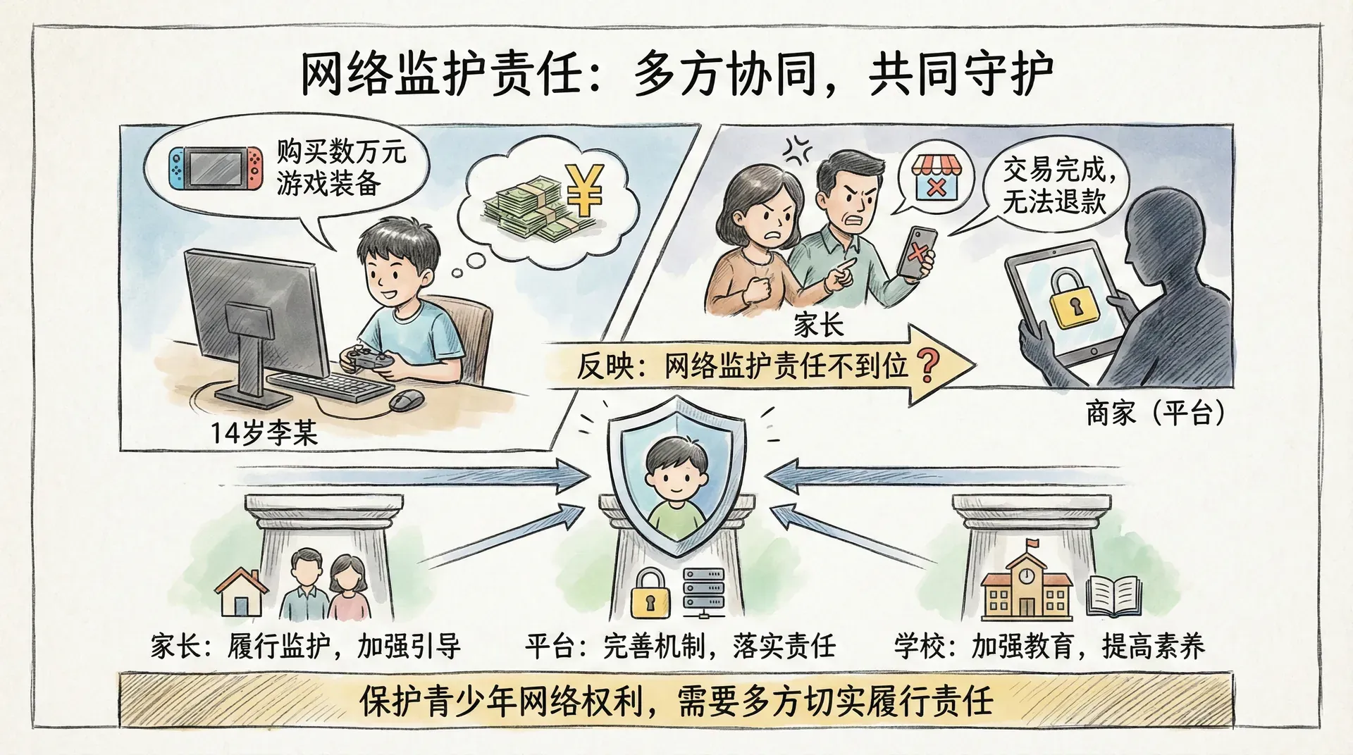 14岁的李某通过网络购买了价值数万元的游戏装备,家长发现后要求退款,商家却表示交易已完成无法退款。类似的事件屡见不鲜,反映出网络监护责任落实不到位的问题。保护青少年网络权利,需要家长、平台、学校等多方主体切实履行监护和保护责任。
