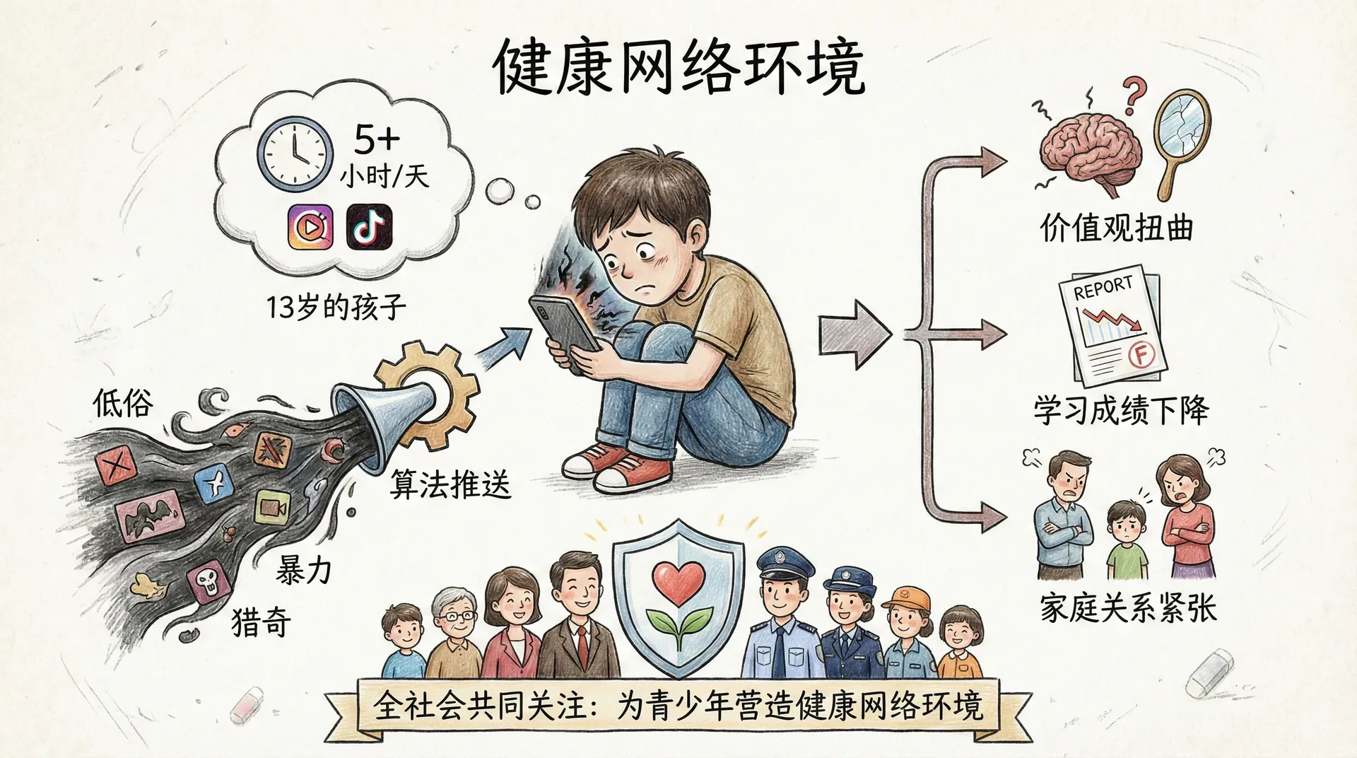 一个13岁的男孩沉迷于某短视频平台,每天刷视频的时间超过5个小时。他的推荐页面充斥着各种低俗、暴力、猎奇的内容,这些内容在算法的推送下源源不断地呈现在他眼前。长期接触这些不良内容,导致这个男孩的价值观发生扭曲,学习成绩一落千丈,与父母的关系也日益紧张。为青少年营造健康的网络环境,已经成为全社会共同关注的重要课题。