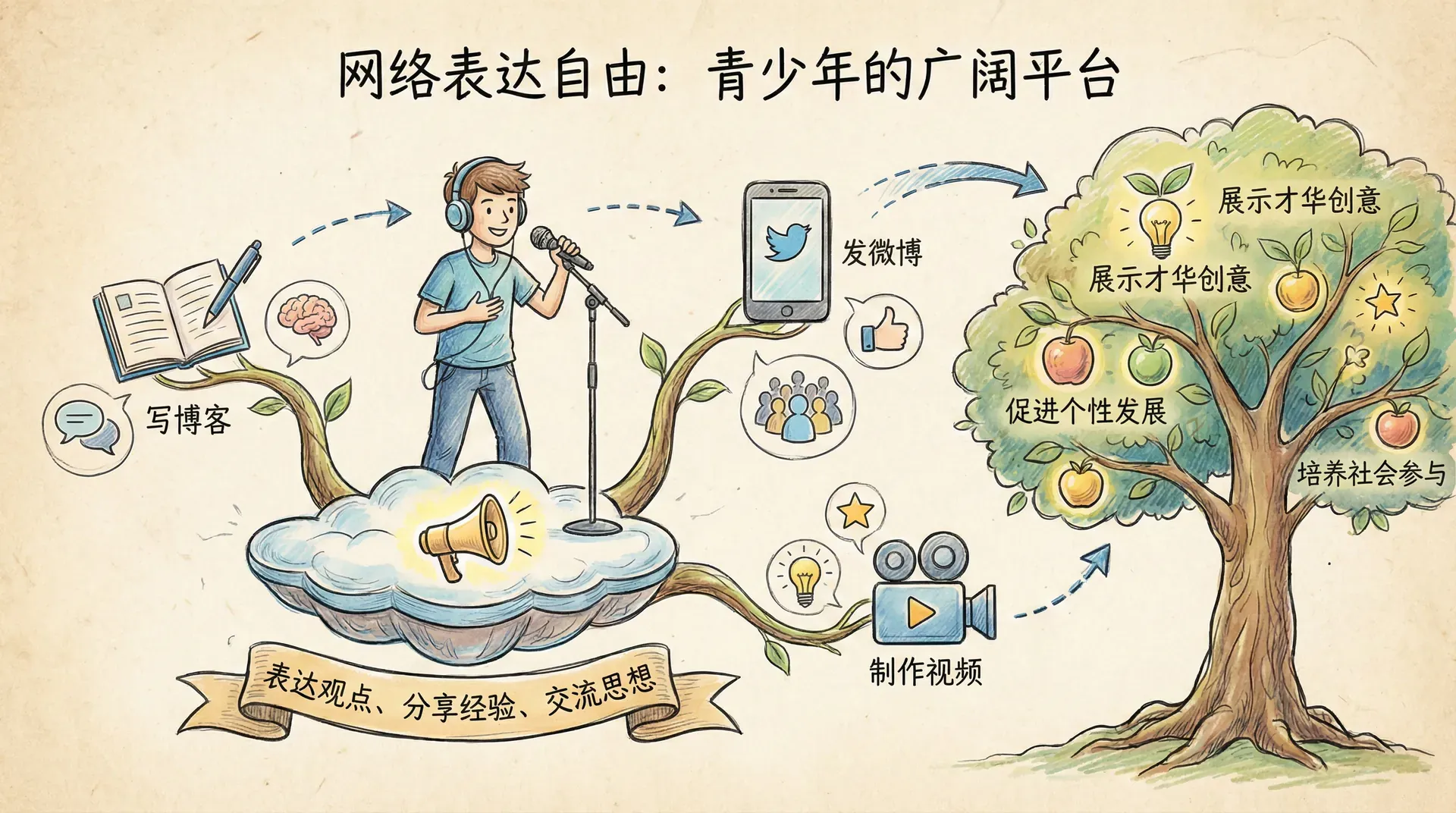 网络为青少年提供了表达观点、分享经验、交流思想的广阔平台。青少年通过写博客、发微博、制作视频等方式表达自己的所思所想,展示自己的才华和创意,这对其个性发展和社会参与能力的培养都有积极意义。