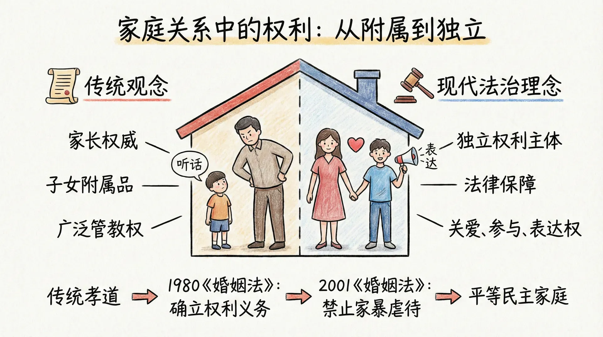 中国传统文化强调孝道和家长权威,父母对子女拥有广泛的管教权。这种家庭模式在维护家庭秩序、传承文化传统方面发挥了积极作用,但也容易忽视青少年的主体地位和自主权利。新中国成立后,特别是改革开放以来,家庭关系逐步走向平等化和民主化。1980年颁布的《婚姻法》首次明确父母对子女有抚养教育的义务,子女对父母有赡养扶助的义务,确立了家庭成员之间的权利义务关系。2001年修订的《婚姻法》进一步强化了对未成年子女权益的保护,禁止家庭暴力和虐待遗弃行为。