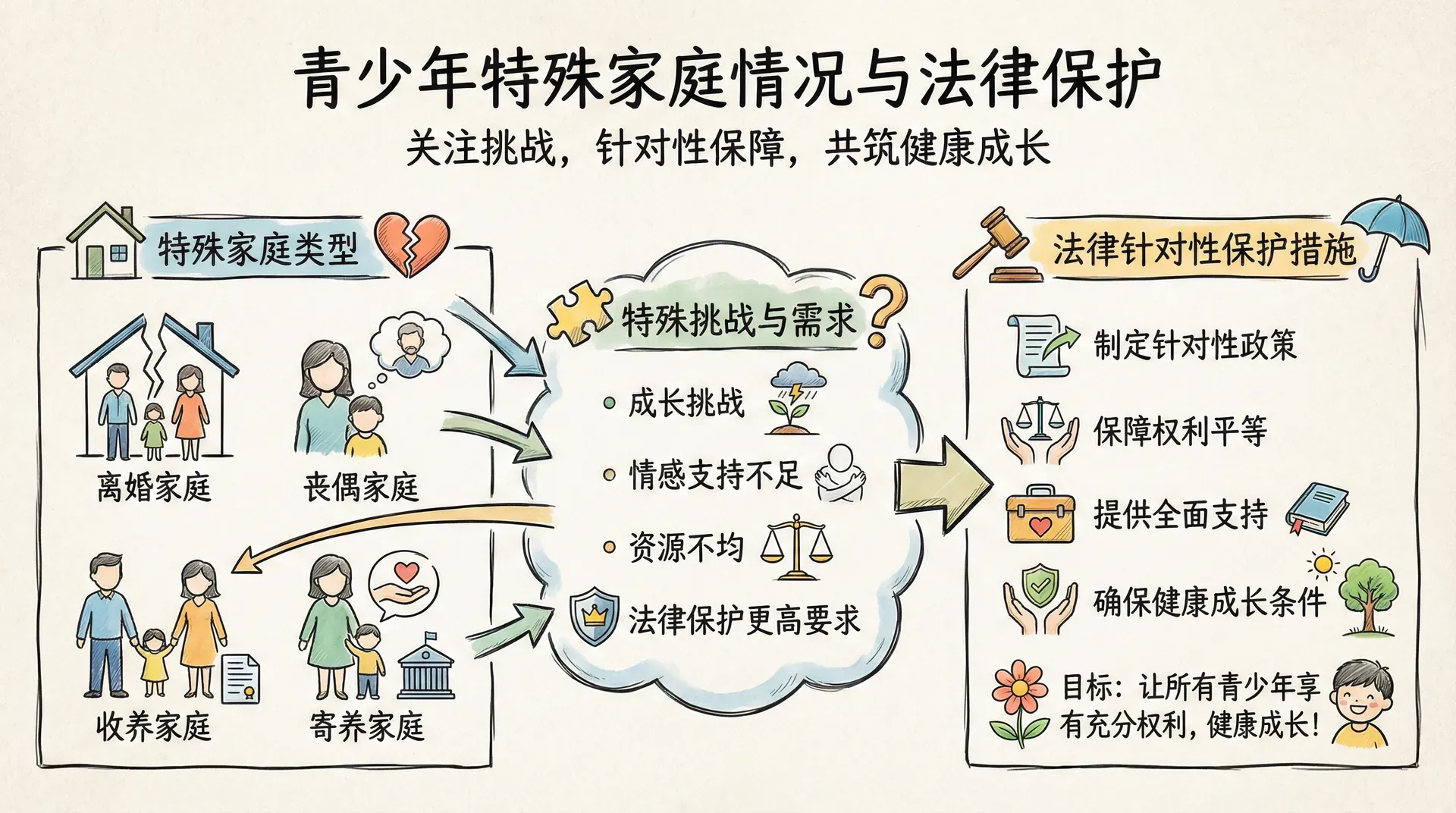 并非所有青少年都生活在完整的双亲家庭中。因为离婚、丧偶、收养、寄养等原因,许多青少年生活在特殊的家庭结构中。这些特殊家庭情况给青少年的成长带来特殊挑战,也对法律保护提出更高要求。法律需要针对不同类型的特殊家庭,制定有针对性的保护措施,确保这些家庭中的青少年同样能够享有充分的权利,获得健康成长所需的条件。