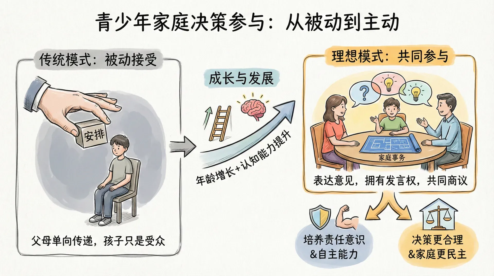 青少年在家庭中不应当只是被动接受父母安排的对象,而应当是家庭生活的参与者。随着年龄的增长和认知能力的发展,青少年对家庭事务和涉及自身利益的事项应当拥有发言权和参与权。这种参与权的行使,既有利于培养青少年的责任意识和自主能力,也有助于家庭决策更加合理和民主。