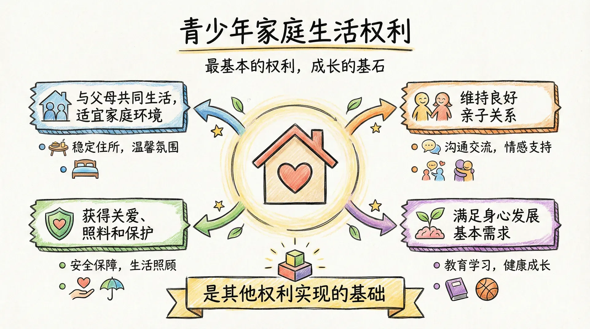 家庭生活权利是青少年最基本的权利之一,包括与父母共同生活、享有适宜的家庭环境、维持良好的亲子关系等。保障青少年在家庭中获得关爱、照料和保护,满足其身心发展的基本需求,是其他权利得以实现的基础。