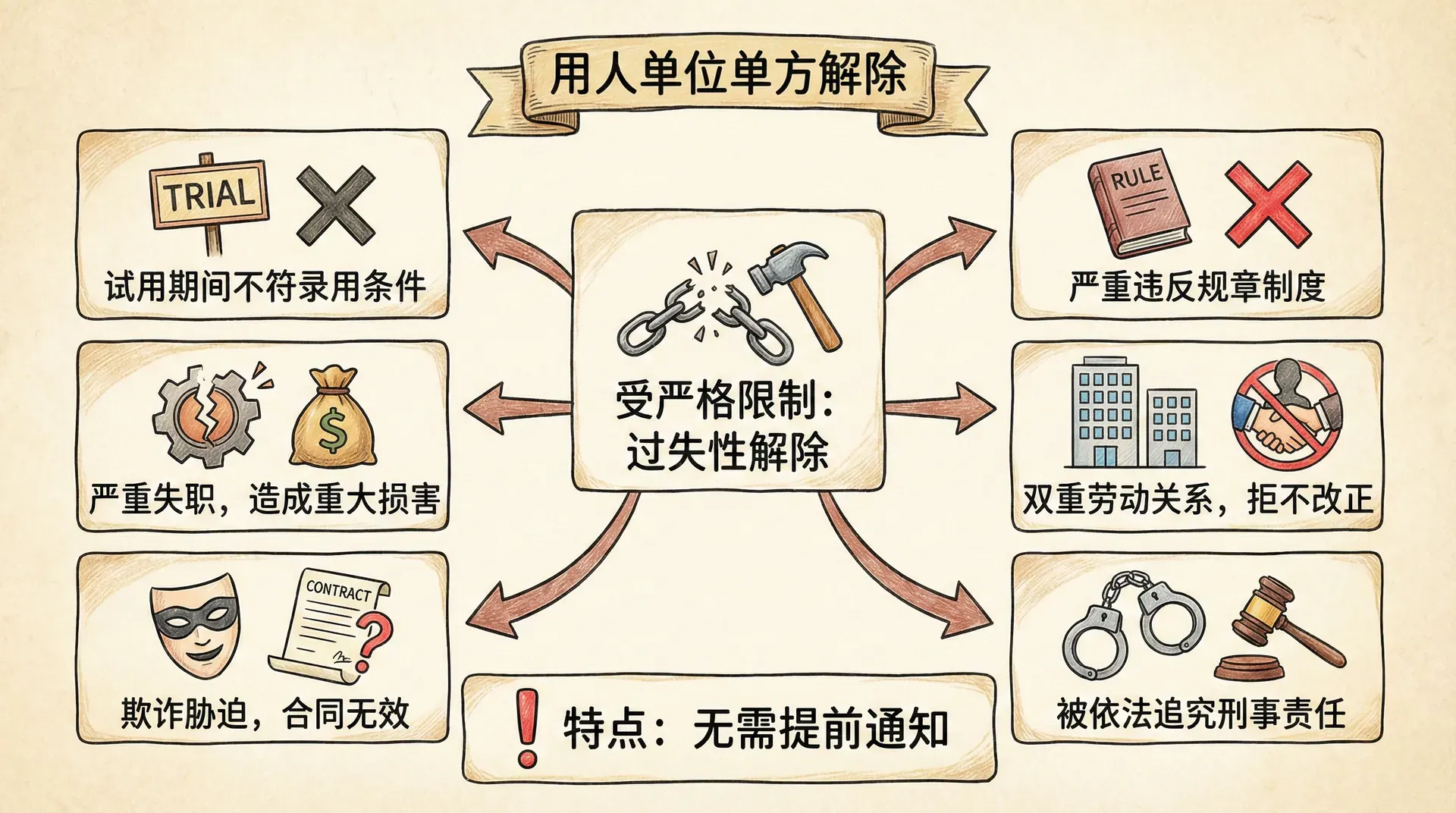 用人单位单方解除劳动合同受到严格限制,必须符合法定情形和程序。用人单位单方解除分为过失性解除、无过失性解除和经济性裁员三种类型。