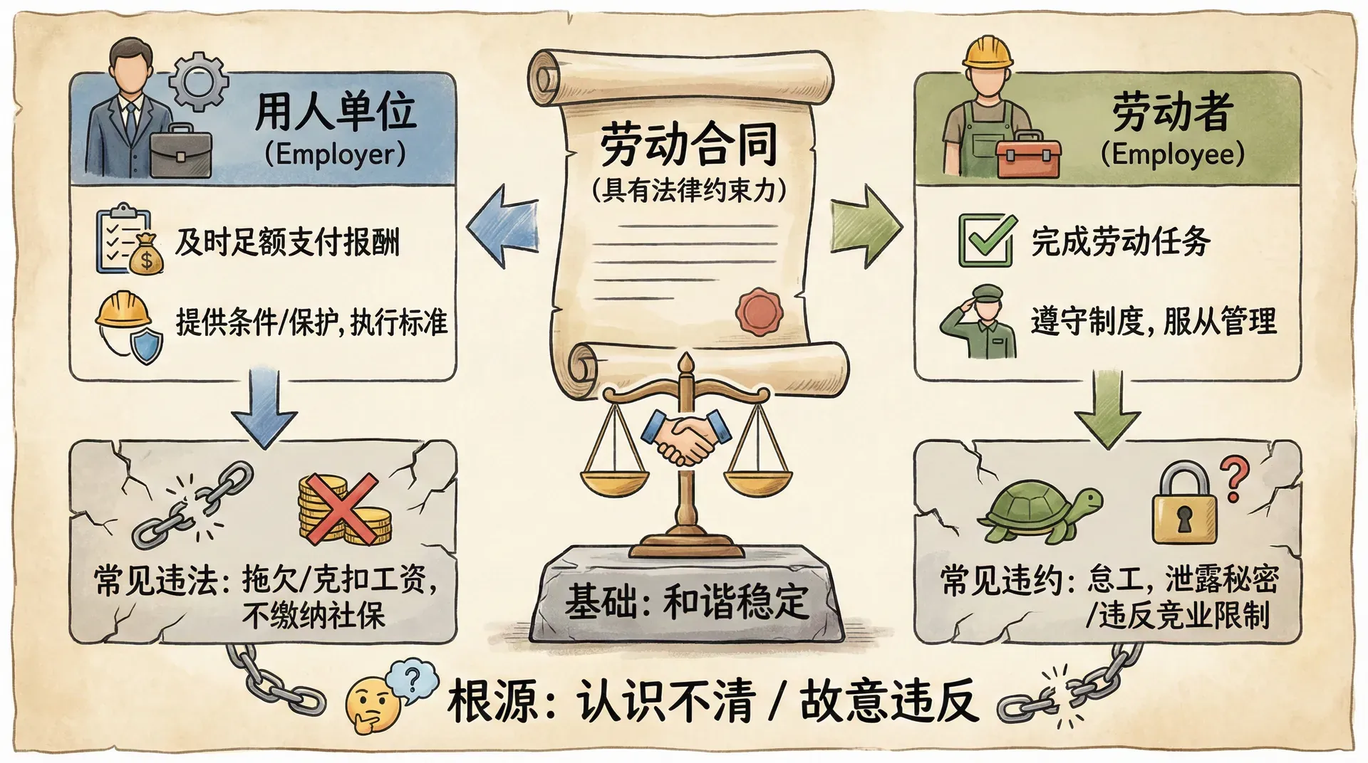 劳动合同的全面履行是劳动关系和谐稳定的基础。现实中,用人单位拖欠工资、克扣工资、不缴纳社会保险等违法行为时有发生,劳动者怠工、泄露商业秘密、违反竞业限制等违约行为也并不少见。这些问题的根源在于劳动关系双方对劳动合同义务的认识不清或故意违反。