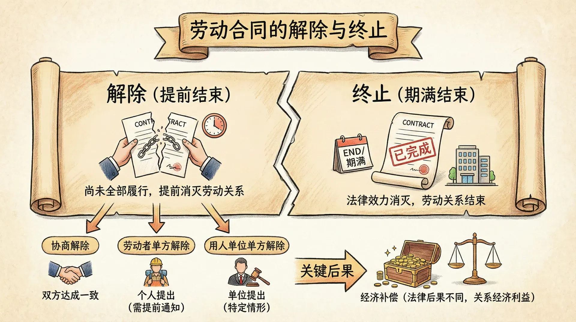 劳动合同的解除分为协商解除、劳动者单方解除和用人单位单方解除三种类型。不同解除方式的法律后果不同,特别是经济补偿的支付问题,直接关系到双方的经济利益。