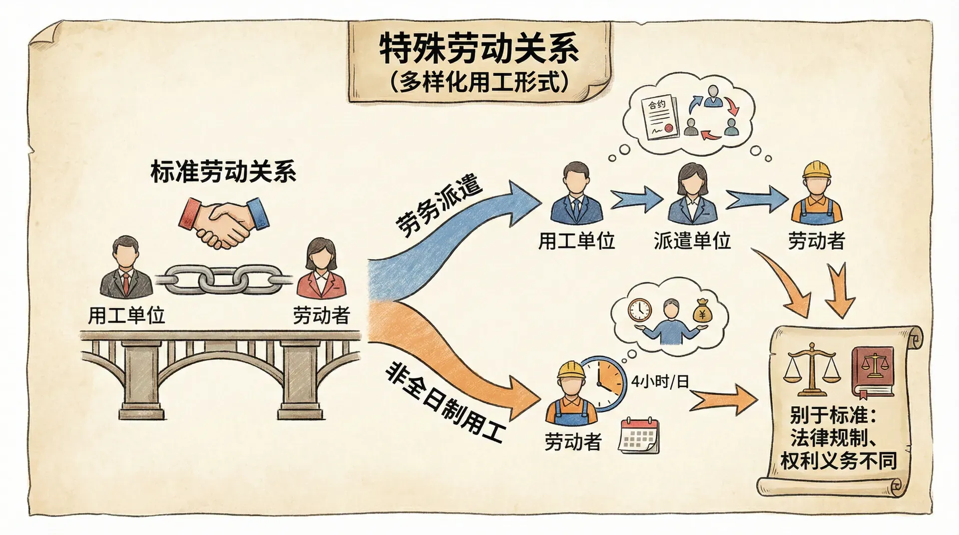 随着经济社会发展,劳动用工形式日益多样化。除标准劳动关系外,劳务派遣、非全日制用工等特殊用工形式广泛存在。这些特殊用工形式在法律规制、权利义务、管理方式等方面都有别于标准劳动关系。