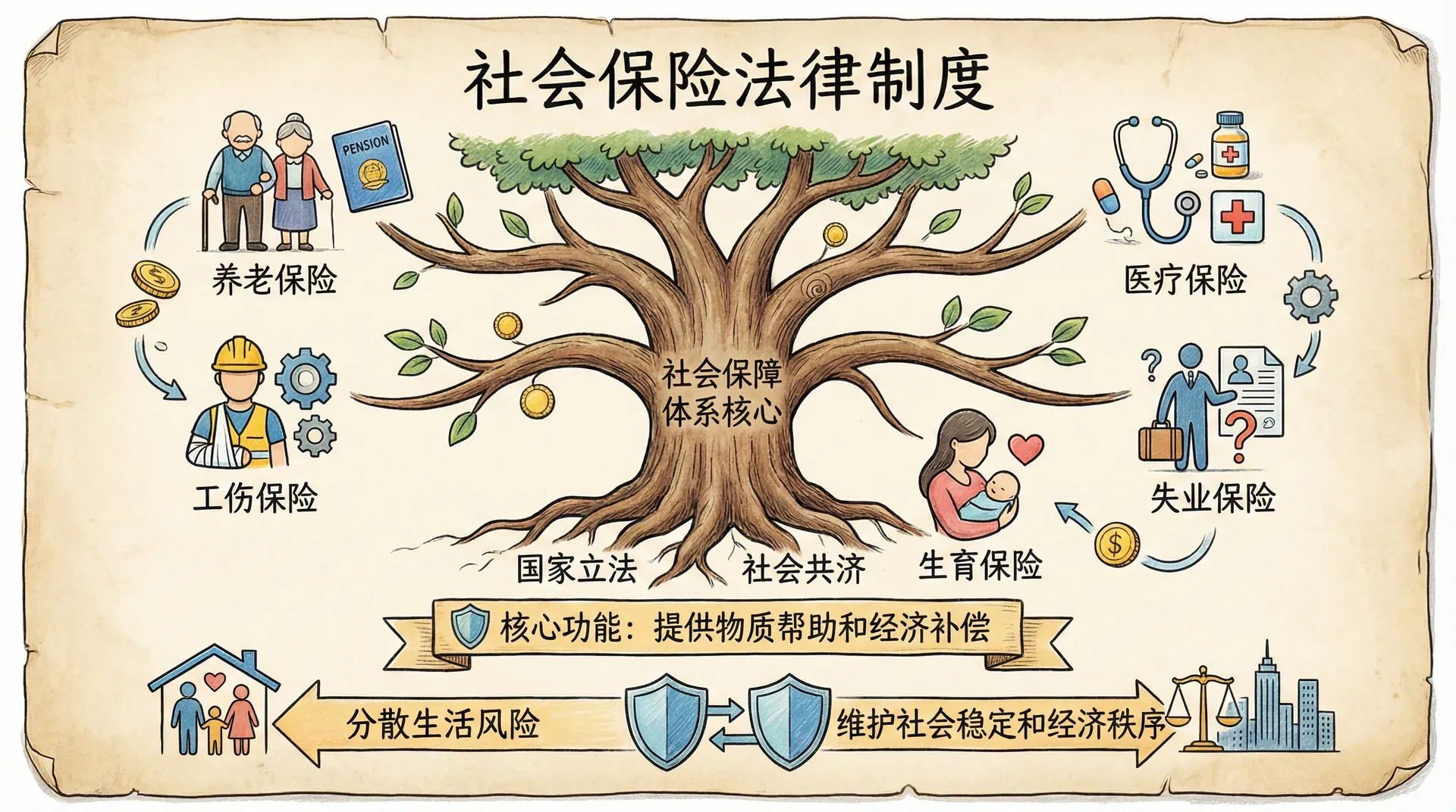 2010年10月,《中华人民共和国社会保险法》经全国人大常委会通过,这是中国社会保险领域第一部综合性法律,系统规定了基本养老保险、基本医疗保险、工伤保险、失业保险、生育保险五项社会保险制度的基本框架、运行机制和法律责任。该法的颁布实施,标志着中国社会保险制度进入法治化轨道。2018年,国务院机构改革将生育保险与职工基本医疗保险合并实施,进一步整合社会保险管理资源。