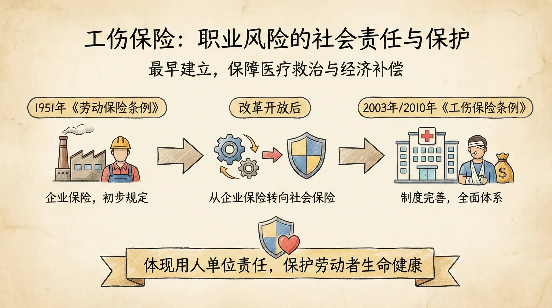 工伤保险制度在中国有着悠久的历史。1951年《中华人民共和国劳动保险条例》就规定了工伤保险待遇。改革开放后,随着劳动用工制度改革,工伤保险逐步从企业保险转变为社会保险。2003年,国务院颁布《工伤保险条例》,2010年进行了较大修订,建立了较为完善的工伤保险制度体系。