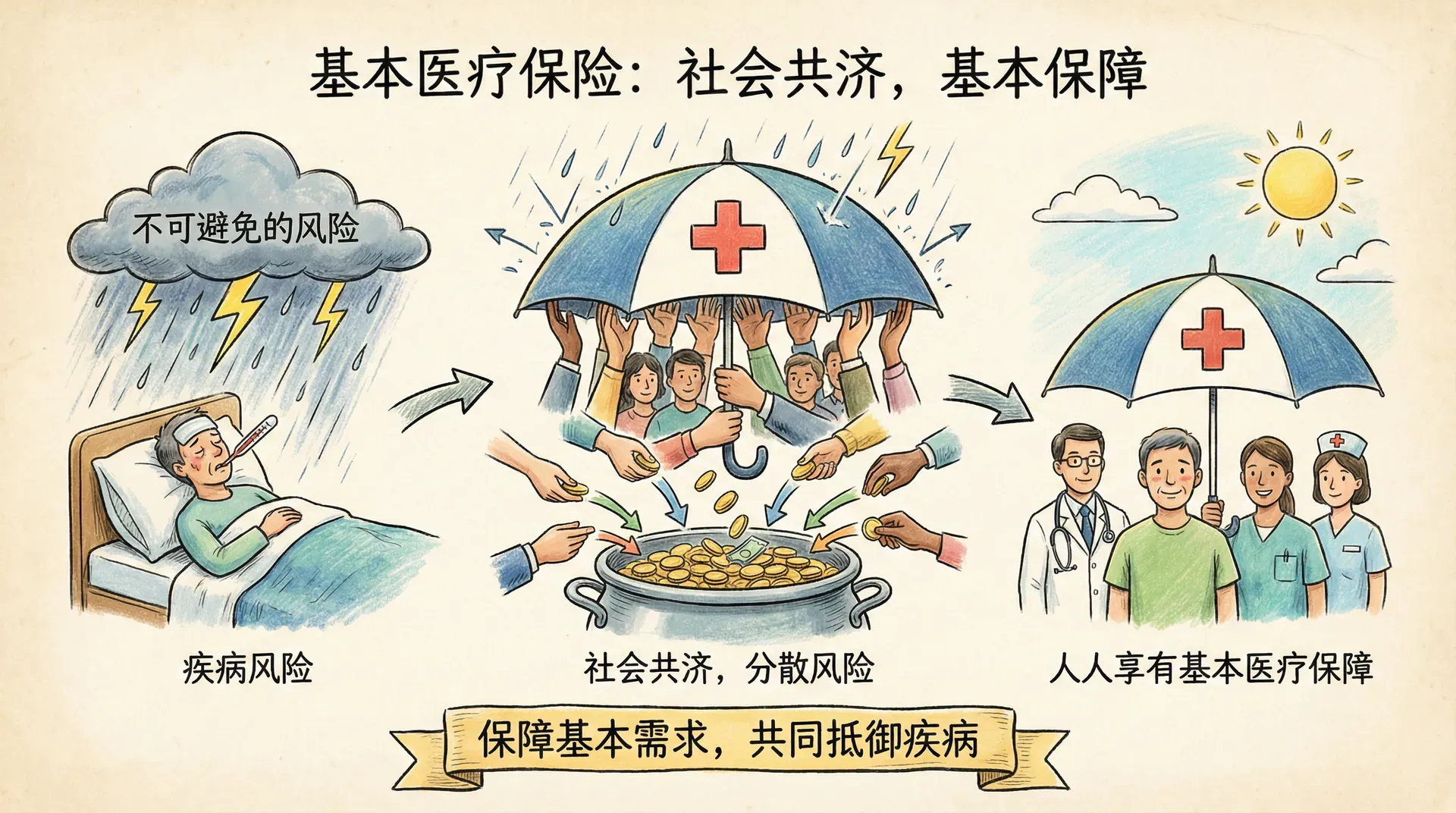 基本医疗保险是为保障参保人员基本医疗需求而建立的社会保险制度。疾病是人生不可避免的风险,医疗保险通过社会共济的方式,分散参保人员的医疗费用风险,使人人都能获得基本医疗保障。