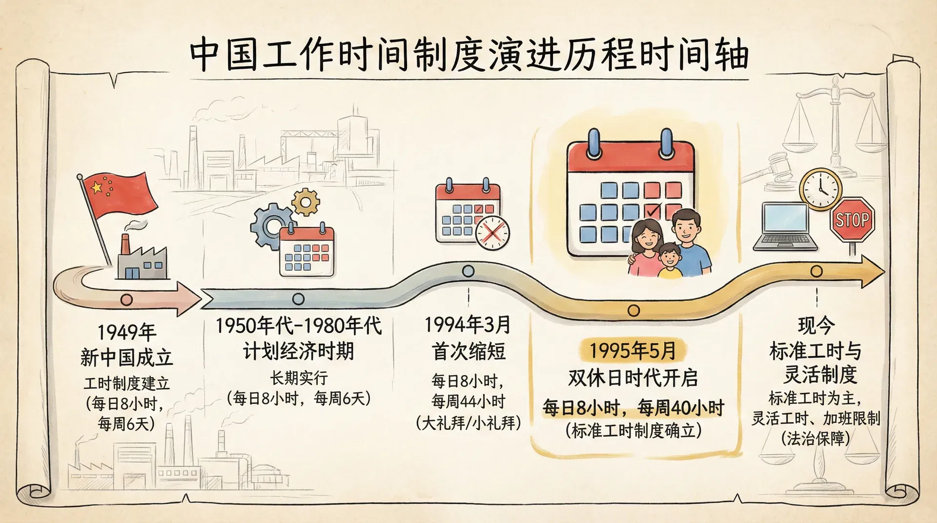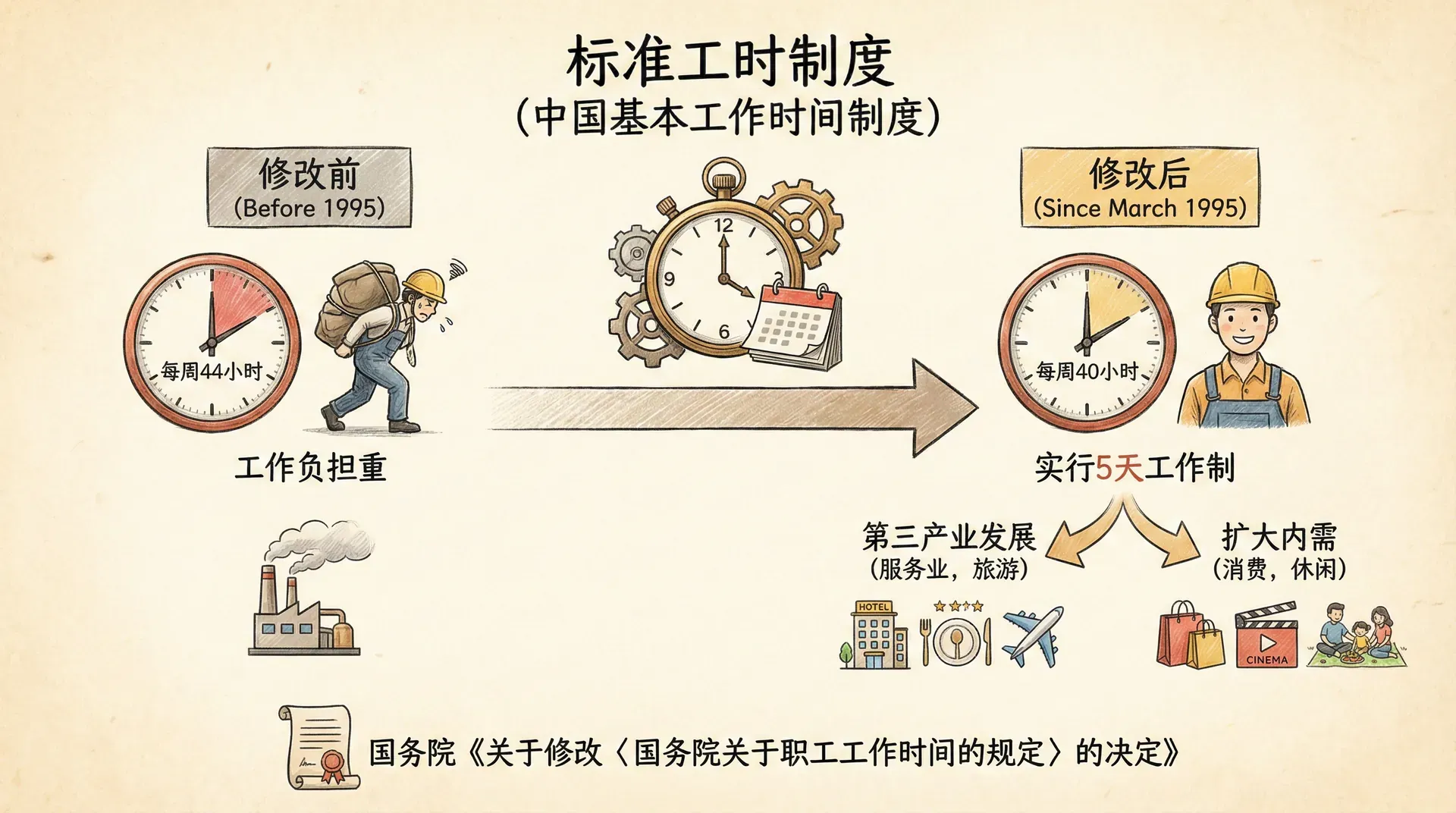 1995年3月25日,国务院发布《关于修改〈国务院关于职工工作时间的规定〉的决定》,将职工每周工作时间从44小时缩短为40小时,实行每周5天工作制。这一调整不仅减少了劳动者的工作时间,也为发展第三产业、扩大内需创造了条件。
