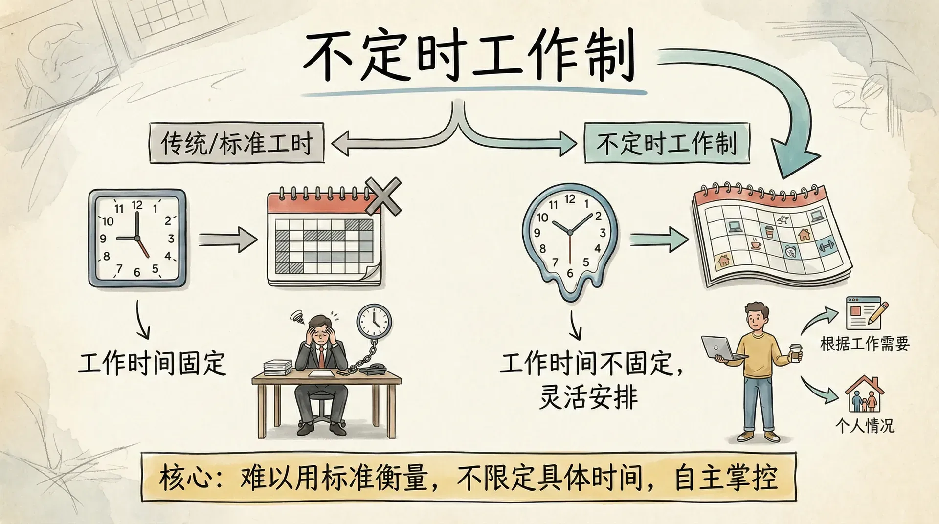 不定时工作制是指用人单位对某些工作时间不固定、难以用标准工时衡量的岗位,不限定劳动者的具体工作时间,劳动者可以根据工作需要和个人情况灵活安排工作时间的工时制度。