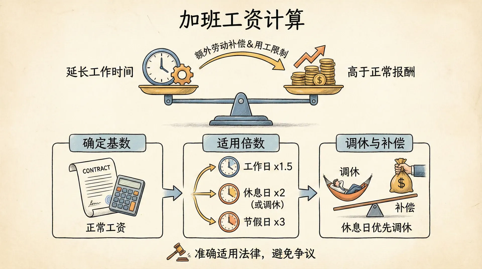 加班工资的计算涉及加班工资基数的确定、不同情形下加班倍数的适用、调休与补偿的关系等问题。这些问题在实践中容易产生争议,需要准确理解和适用法律规定。