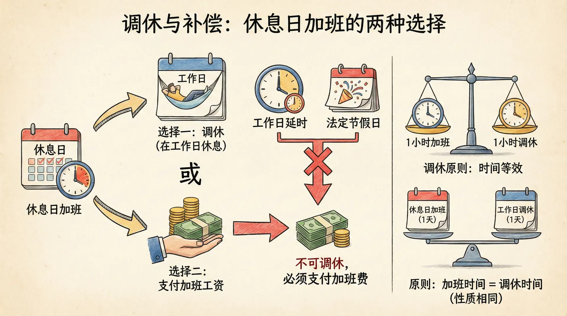 调休的前提是劳动者在休息日加班。如果是工作日延长工作时间或者法定节假日加班,不能用调休代替,必须支付加班工资。