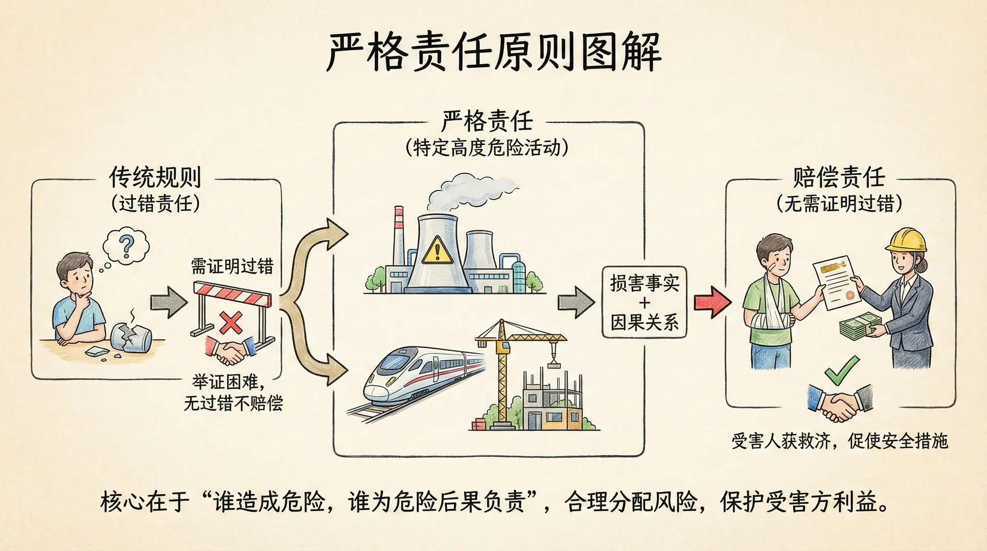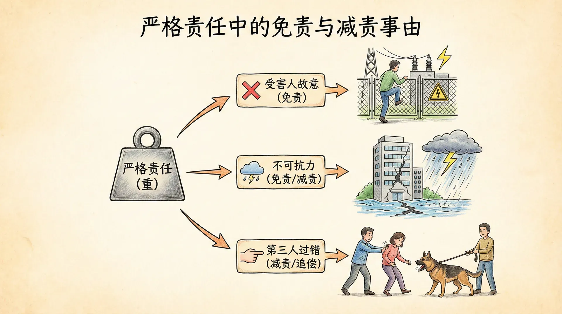 严格责任并非绝对责任。即使适用严格责任原则,行为人在某些法定情形下仍可免责或减轻责任。严格责任的核心在于受害人无需证明行为人存在过错,而非行为人在任何情况下都必须承担责任。