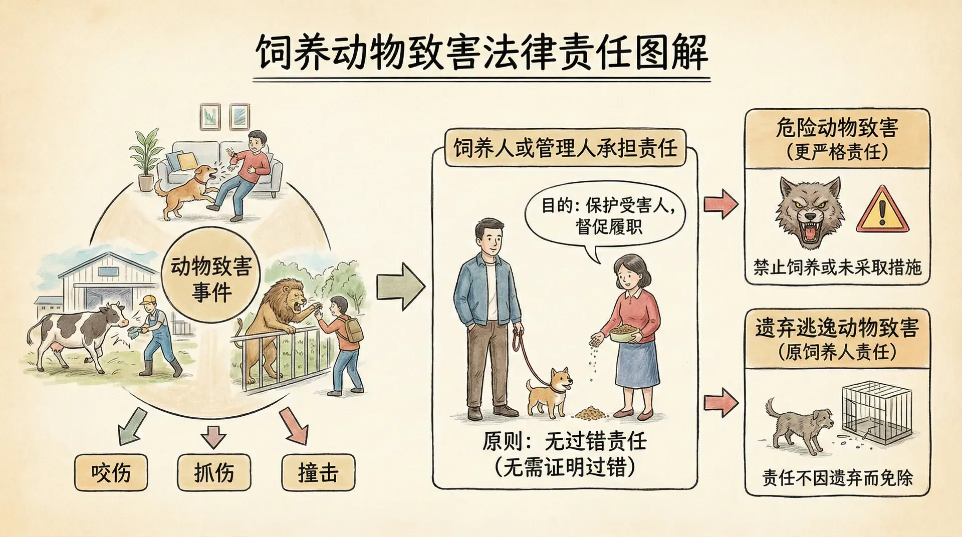 这两类情形的共同特点在于,动物在致害时,往往无法直接找到当前的管理人或饲养人,受害人举证难度较大。为保护受害人的权益,法律规定:在动物遗弃或逃逸期间造成他人损害的,即使动物已不在原饲养人实际控制之下,原饲养人或管理人依然需要承担侵权赔偿责任,不能因“失控”或“无主”推脱法律义务。