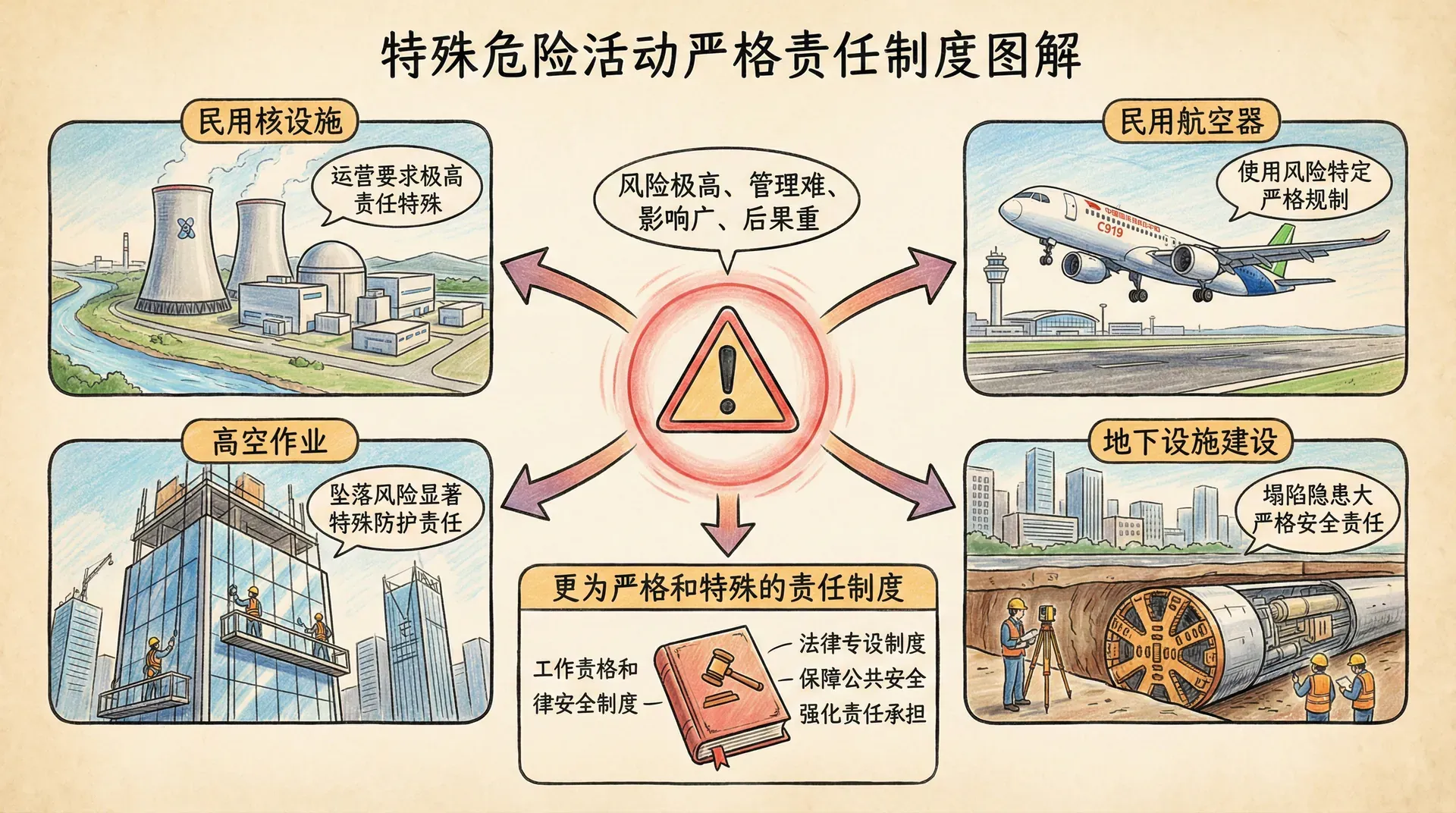 在高度危险活动类别中,还有一些特殊类型的危险活动,由于其风险程度极高、管理难度大、一旦发生事故影响范围广、损失后果严重,法律对这些活动往往专设更为严格和特殊的责任制度。这些特殊危险活动包括民用核设施的运营、民用航空器的使用、高空作业和地下设施建设等。