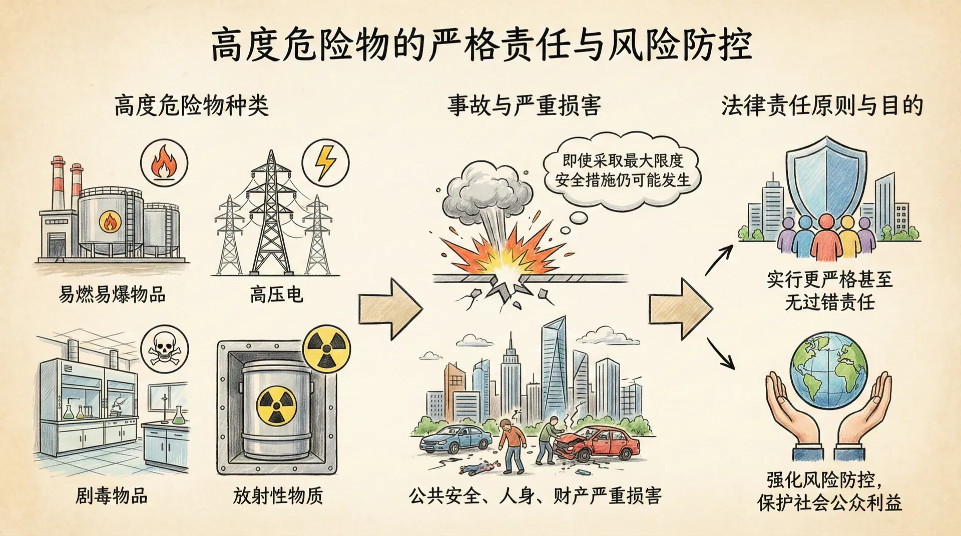 高度危险物是指具有高度危险性,极易对公共安全和人身、财产造成严重损害的物品,包括易燃易爆物品、高压电、剧毒物品、放射性物质等。这些物品在生产、存储、运输和使用过程中,一旦发生事故,可能导致大范围人身伤亡和重大财产损失。为加强风险防控,保护社会公众利益,法律对高度危险物相关活动规定了比普通侵权更为严格甚至无过错的责任原则,要求管理者和相关单位在尽到最大限度安全义务的同时,如因高度危险物造成损害,仍需承担赔偿责任。
