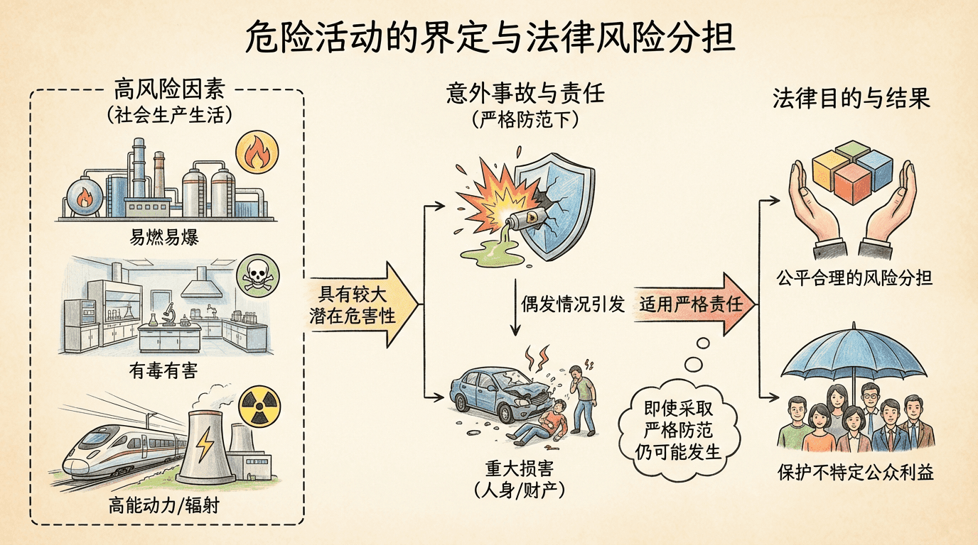 适用严格责任原则时,首先需明确什么是“危险活动”。危险活动通常指在社会生产、生活中具有较大潜在危害性,一旦发生意外可能对他人人身或财产造成重大损害的活动。这些活动往往涉及易燃、易爆、有毒、有强烈辐射或高能动力等因素,因其本身的高风险性,即使从业者已采取严格防范措施,仍可能因不可预见的偶发情况引发事故。法律将此类活动纳入严格责任的适用范围,旨在强化安全意识,实现公平合理的风险分担,保护不特定公众的利益。