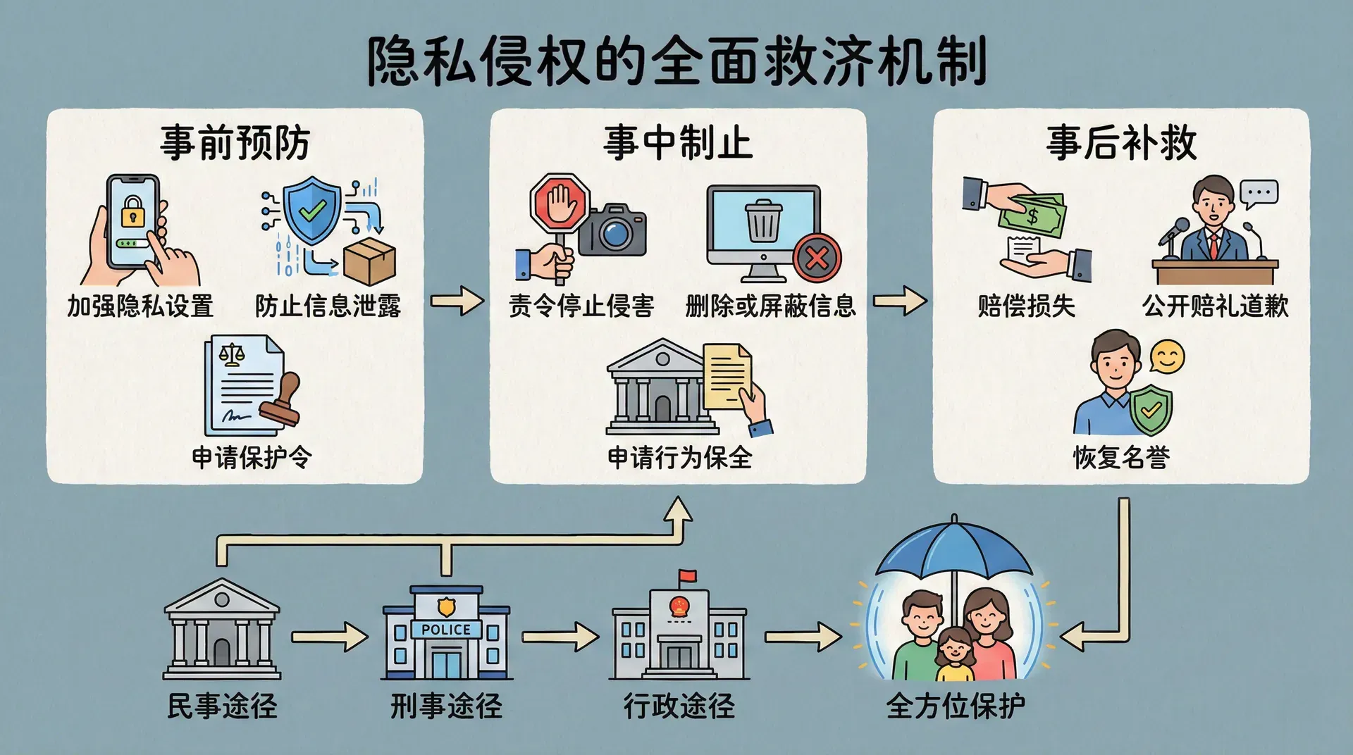 在事前阶段,个人可以通过申请保护令、防止信息泄露、加强隐私设置等手段预防侵害的发生;在侵权过程中,受害人可以申请法院或行政机关及时采取行为保全、责令停止侵害、删除或屏蔽相关信息等手段,立即制止正在发生的侵权行为;而在事后阶段,受害人还可以依法追究侵权人的法律责任,申请赔偿损失、要求公开赔礼道歉、恢复名誉等多种补救措施,实现对自身合法权益的最大化保护。这些救济方式既包括民事途径,也涵盖行政、刑事等多元化手段,确保对隐私权的侵害能够得到及时、有力的遏制和弥补。