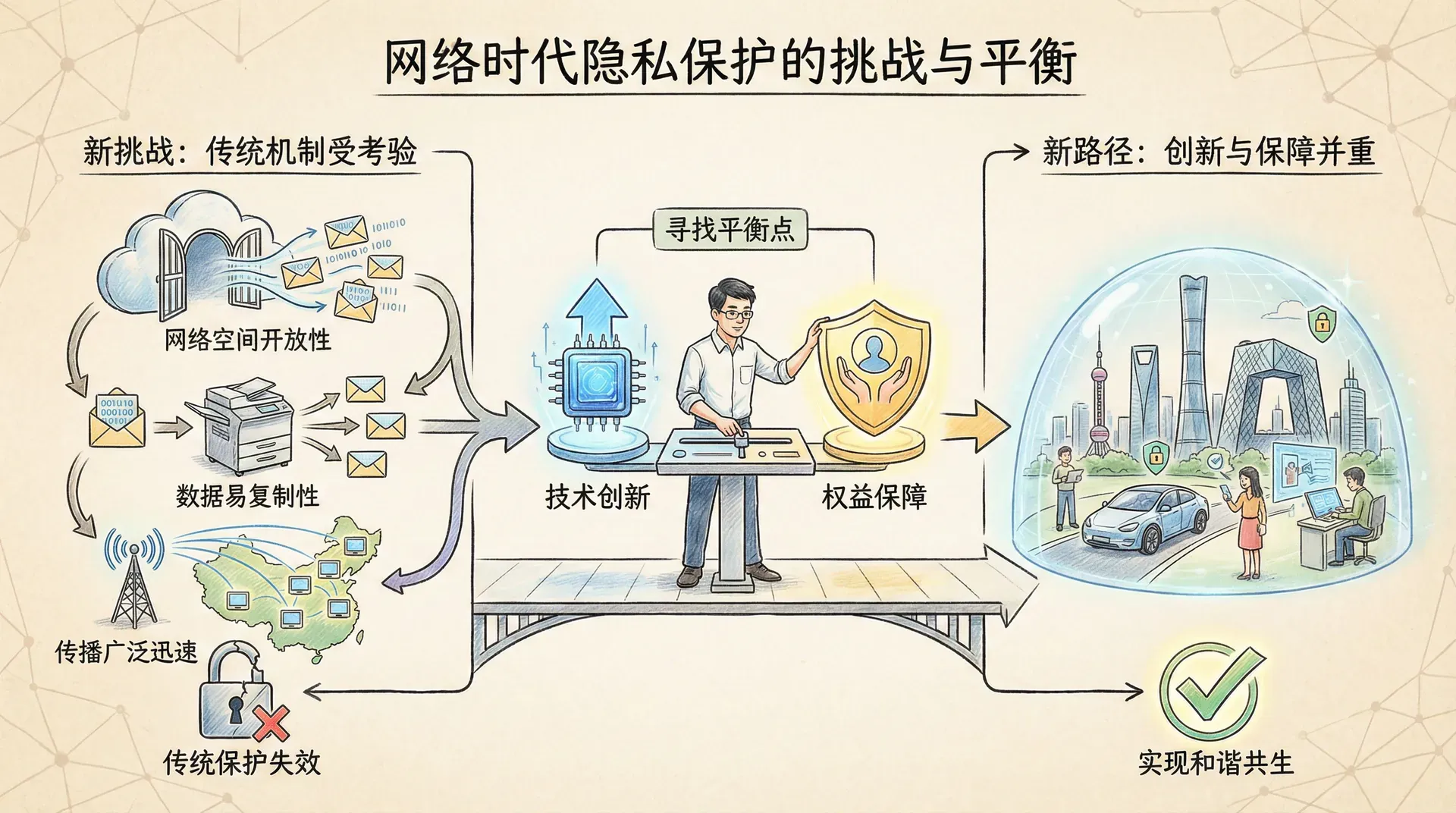 互联网和数字技术的发展给隐私保护带来了前所未有的挑战。网络空间的开放性、数据的可复制性、传播的广泛性,使得传统的隐私保护机制面临新的考验。网络时代的隐私保护需要在技术创新和权益保障之间寻找平衡点。