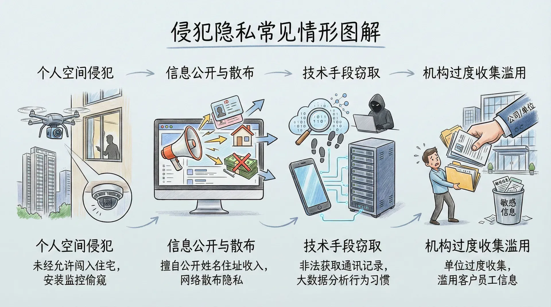 隐私权的侵犯在日常生活中表现形式多样,涵盖了个人空间、通信内容、个人信息、生活细节等诸多方面。随着社会交往日趋频繁,人与人之间的信息交流与互动大量依赖现代技术,隐私被侵犯的渠道越来越多样。