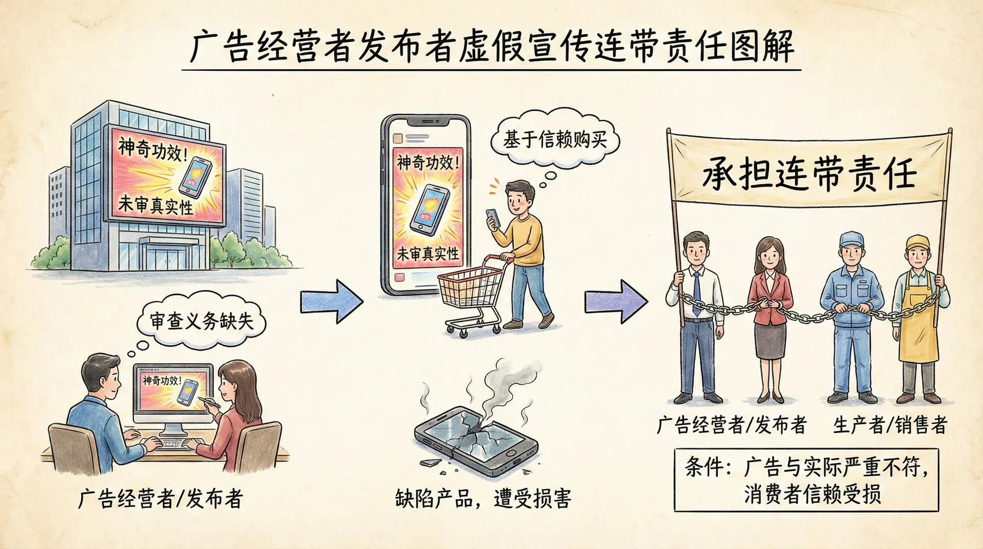 广告经营者和发布者应当审查广告内容的真实性,不得发布虚假广告。如果广告中对产品的宣传与产品的实际情况严重不符,消费者基于对广告的信赖购买产品并遭受损害,广告经营者和发布者应当与生产者、销售者承担连带责任。