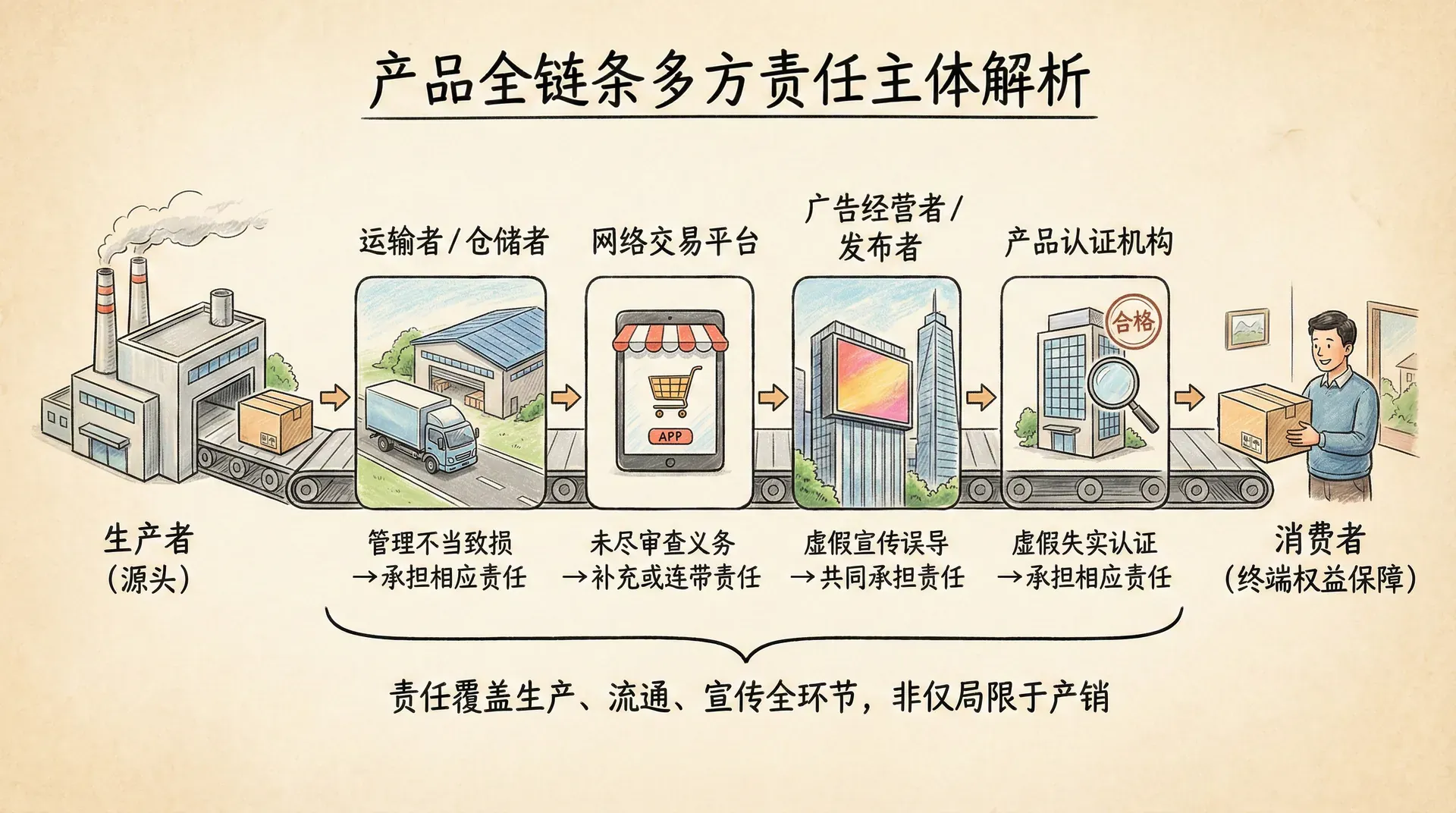 除了生产者和销售者这两个主要责任方以外,产品在从工厂到最终消费者手中的整个流通过程中,还会涉及到运输者、仓储者、网络交易平台、广告经营者、广告发布者、产品认证机构等多个环节和相关主体。