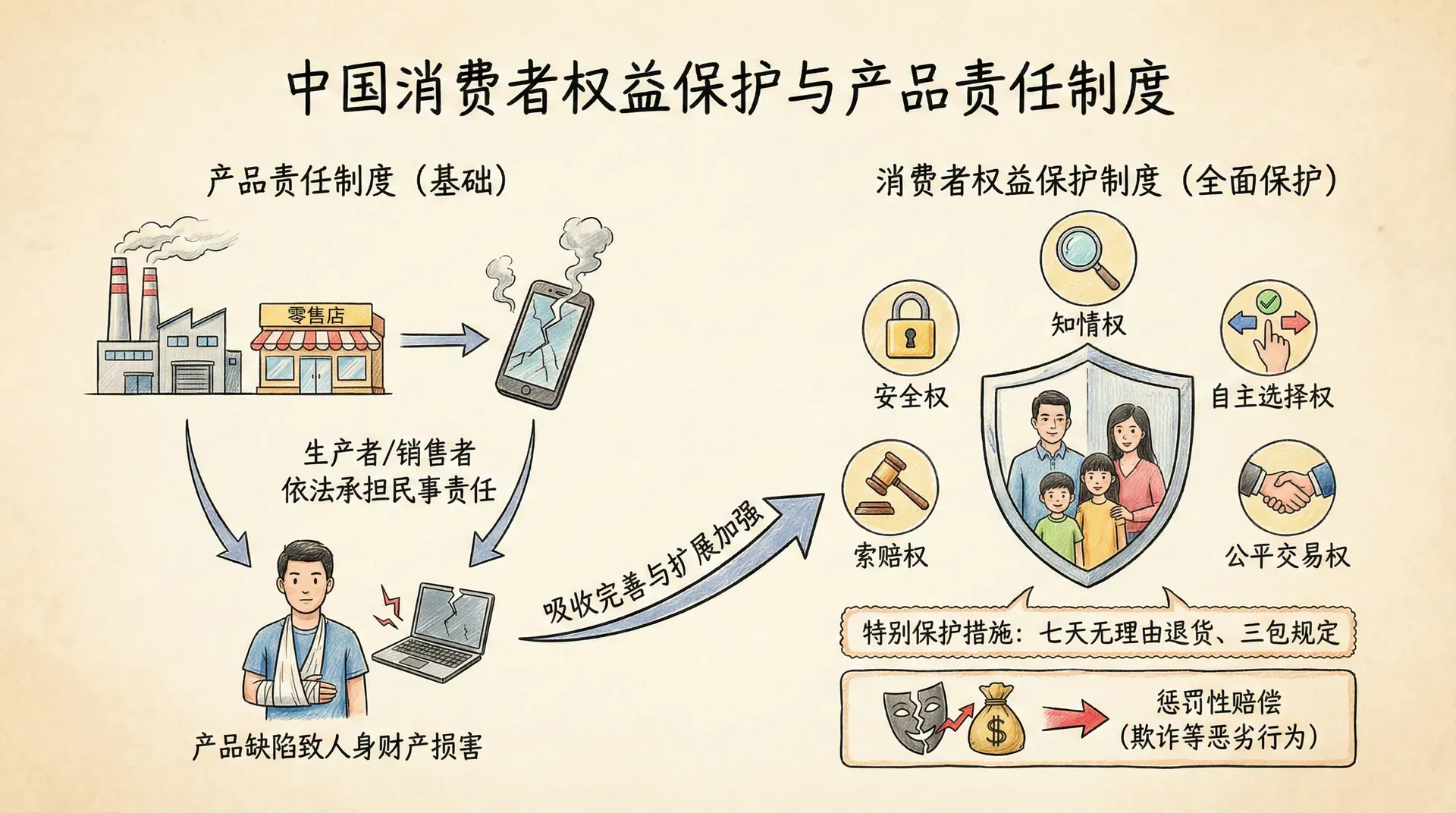 产品责任制度是指生产者、销售者因产品存在缺陷而造成消费者人身、财产损害时,依法承担相应民事责任的一项法律制度。与之紧密联系的,是消费者权益保护制度。消费者权益保护法不仅吸收和完善了产品责任制度的内容,还在此基础上进一步扩展和加强了对消费者的保护力度。
