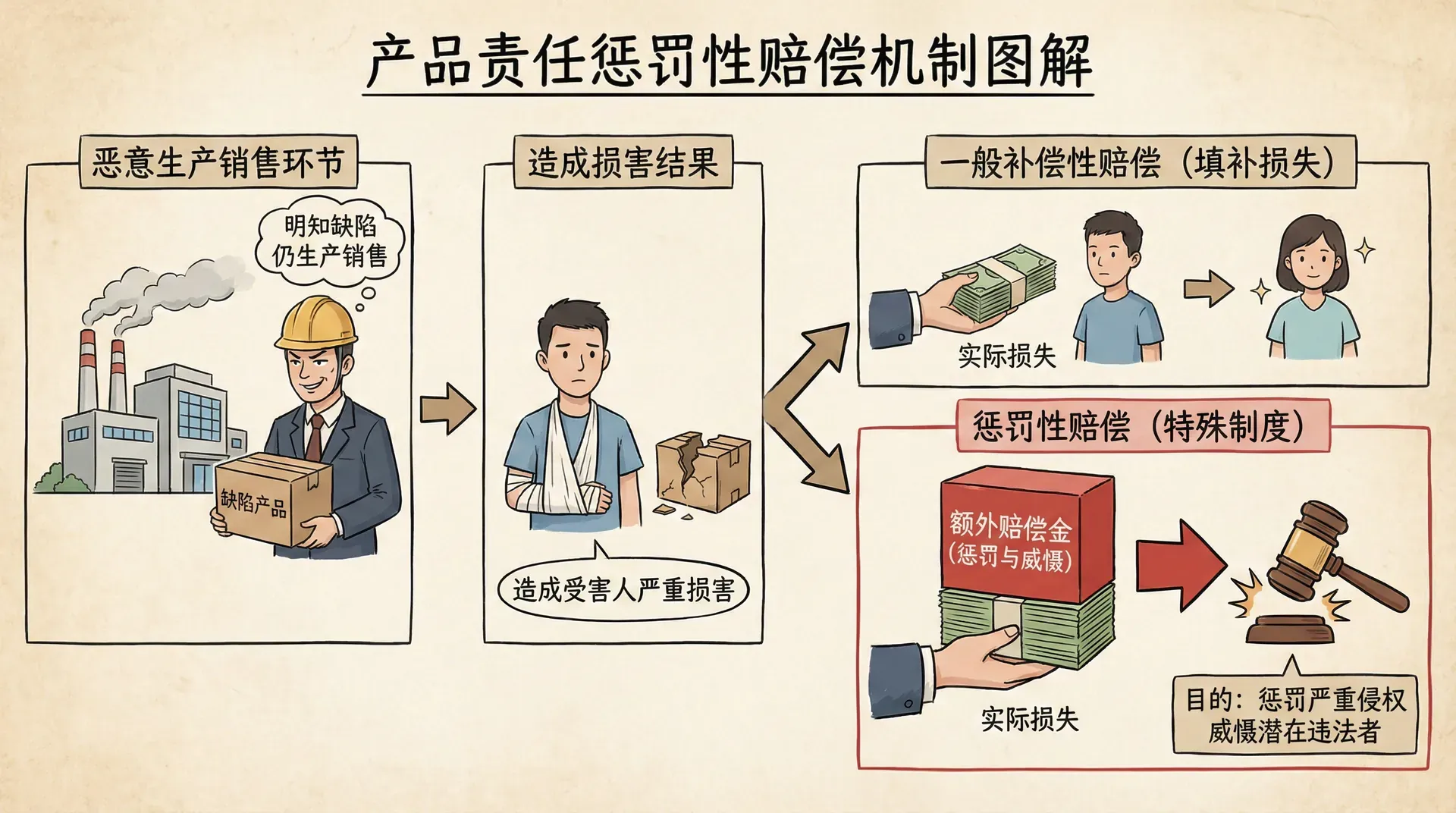 惩罚性赔偿是产品责任制度中的特殊制度。与一般的补偿性赔偿不同,惩罚性赔偿不仅要求侵权人赔偿受害人的实际损失,还要求其支付超出实际损失的额外赔偿金,以惩罚严重的侵权行为,威慑潜在的违法者。在产品责任领域,惩罚性赔偿主要适用于生产者或销售者明知产品存在缺陷仍然生产销售的情形。
