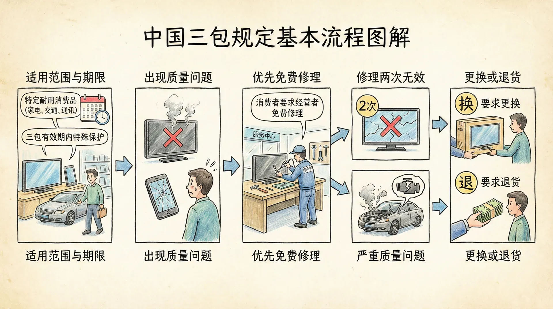 三包是指包修、包换、包退。三包规定适用于特定类型的商品,主要是家用电器、交通工具、通讯设备等耐用消费品。三包规定为消费者提供了质量保证期内的特殊保护。