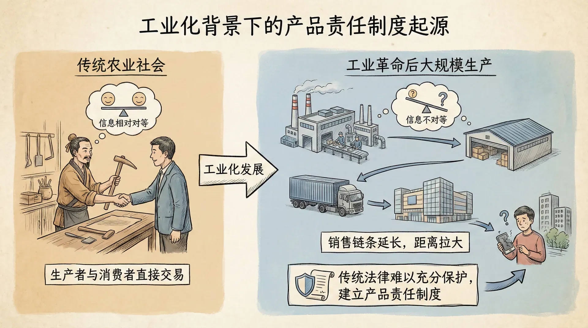 产品责任制度的建立源于工业革命后大规模生产方式的普及。在传统农业社会中,生产者与消费者往往直接见面交易,买卖双方的信息相对对等。随着工业化的发展,商品的生产和销售链条变得越来越长,消费者与生产者之间的距离越来越远。一件商品可能经过设计、生产、批发、零售等多个环节才最终到达消费者手中。此时,如果商品存在质量问题导致消费者受到损害,依靠传统的合同法或过错侵权责任已经难以充分保护消费者的权益。
