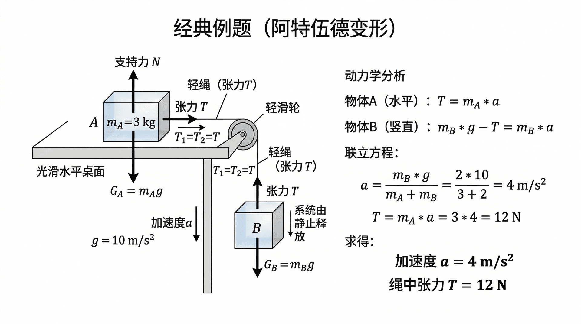 经典例题(阿特伍德变形):A(质量 kg)放在光滑水平桌面上,通过轻绳连接 B(质量 kg),B 悬挂在桌边,系统由静止释放,求加速度和绳中张力。( m/s²)