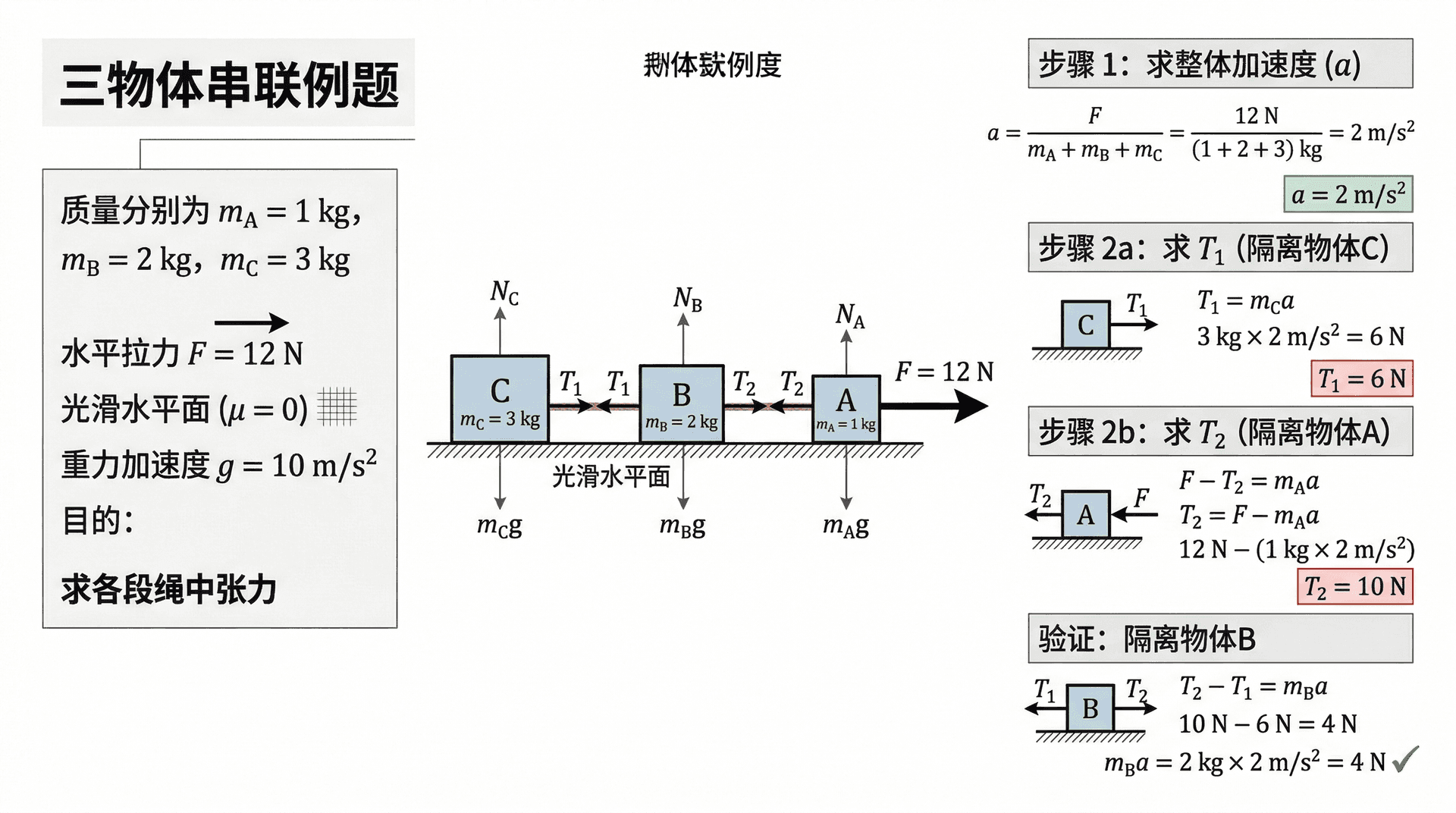 整体法和隔离法是互补的,不是对立的。解题的标准步骤是:先用整体法求出加速度,再对某一物体单独隔离,求出所需的内力。两步配合,效率最高。
