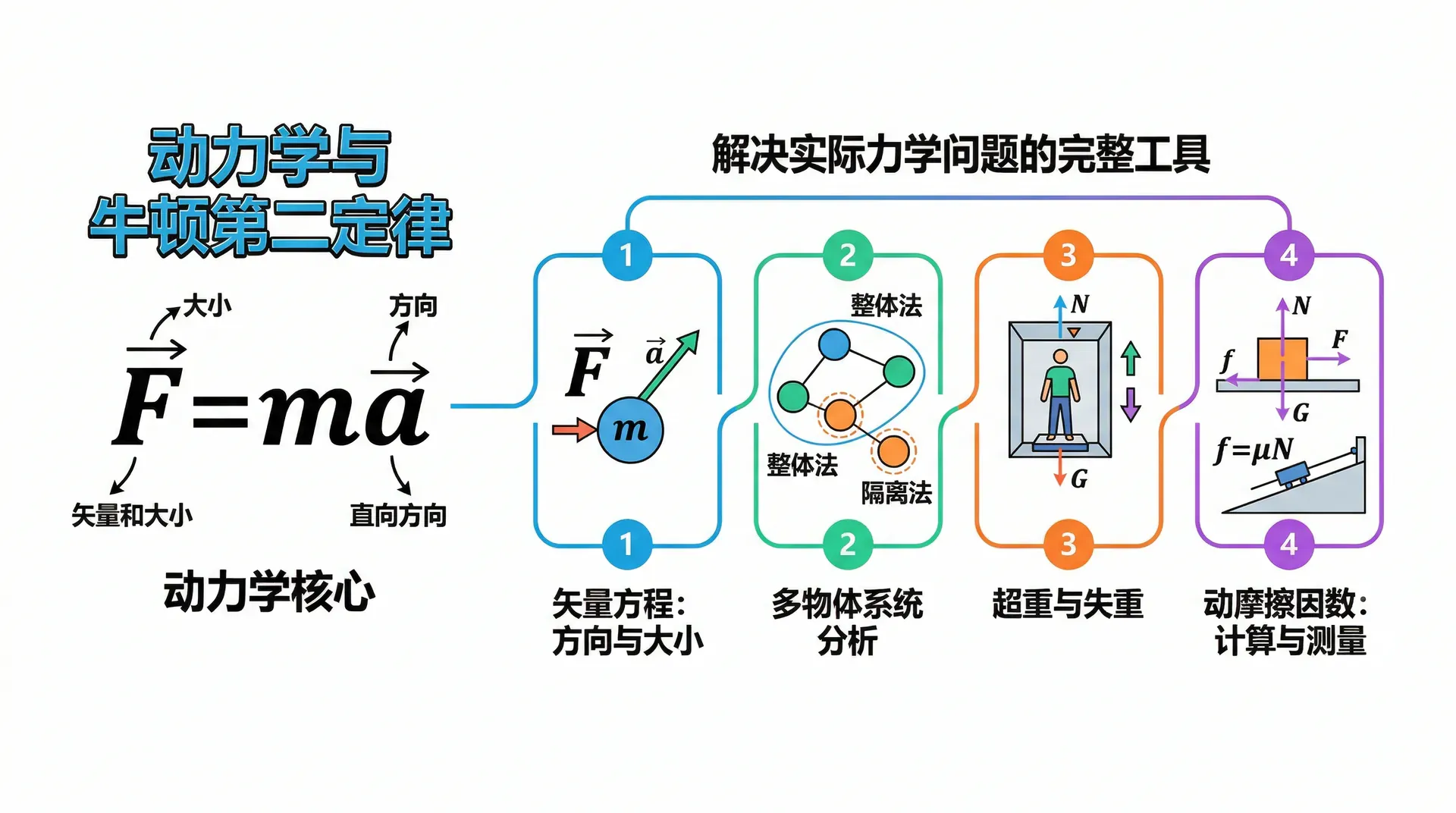 运动学描述了物体怎样运动,动力学则要回答为什么运动。牛顿第二定律 是动力学的核心,但它本质上是一个矢量方程,方向信息和大小同样不可缺少。在此基础上,通过整体法与隔离法分析多物体系统,深入理解超重与失重的物理本质,并掌握动摩擦因数的计算与测量,这四个方面共同构成解决实际力学问题的完整工具。