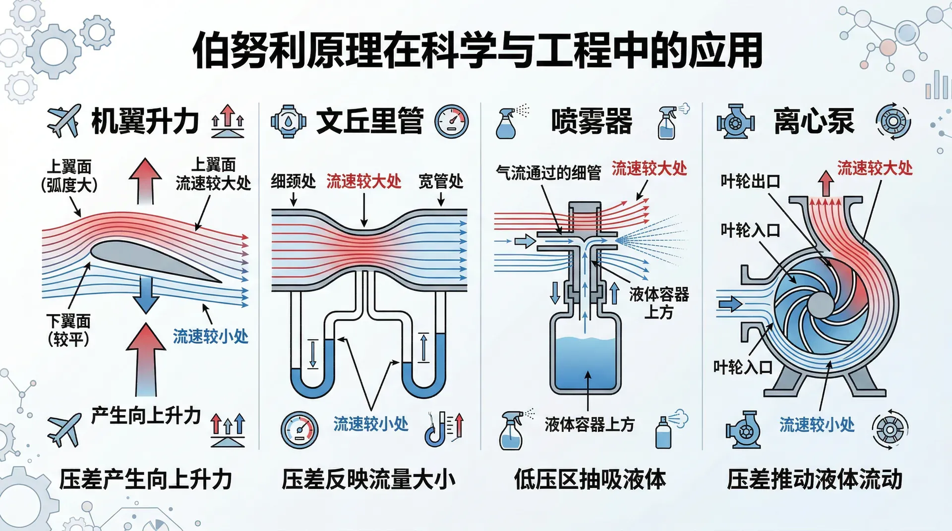 伯努利原理(流速大、压强小)在日常生活和工程技术中有大量应用。