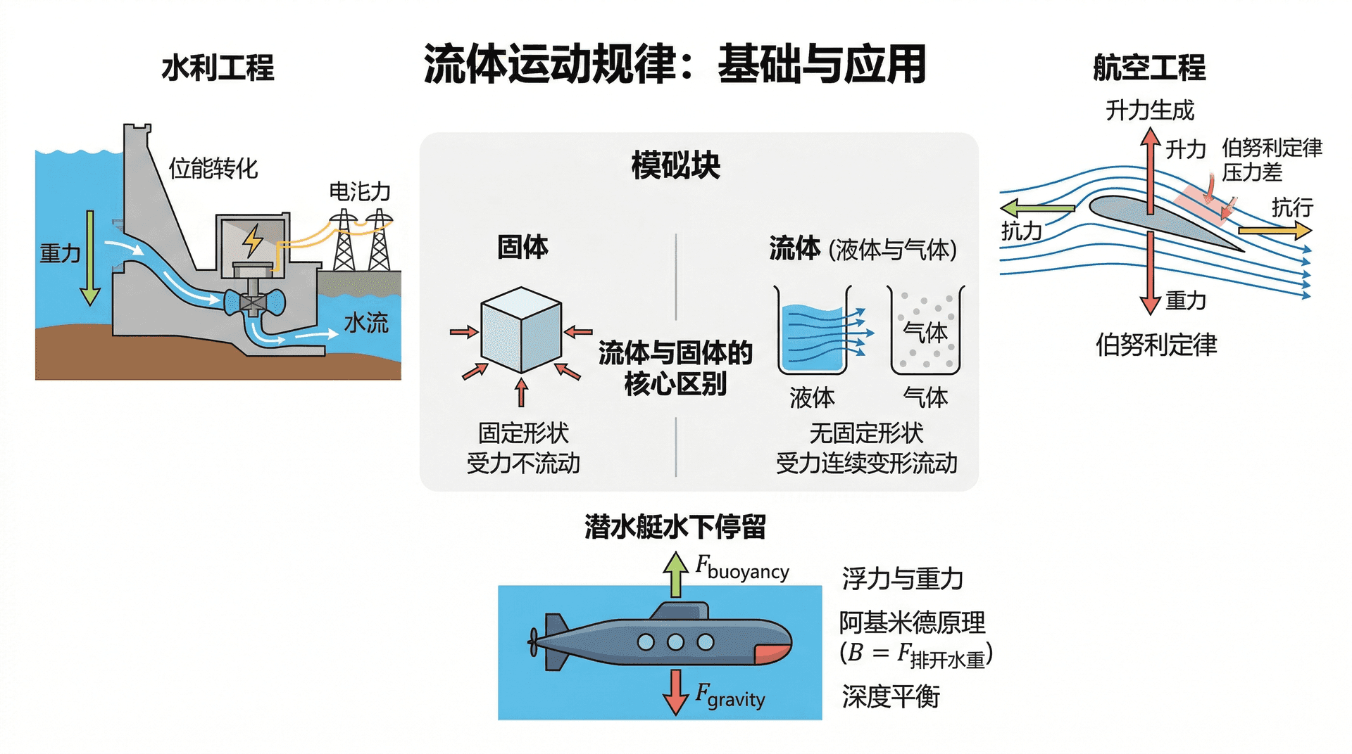 水从高处流向低处,飞机能在空中飞行,潜水艇可以在水下任意深度停留——这些现象背后都涉及流体运动的规律。流体包括液体和气体,与固体最根本的区别在于:流体没有固定形状,在外力作用下会连续变形流动。理解流体力学的基本规律,是航空、水利、医学等众多工程领域的基础。