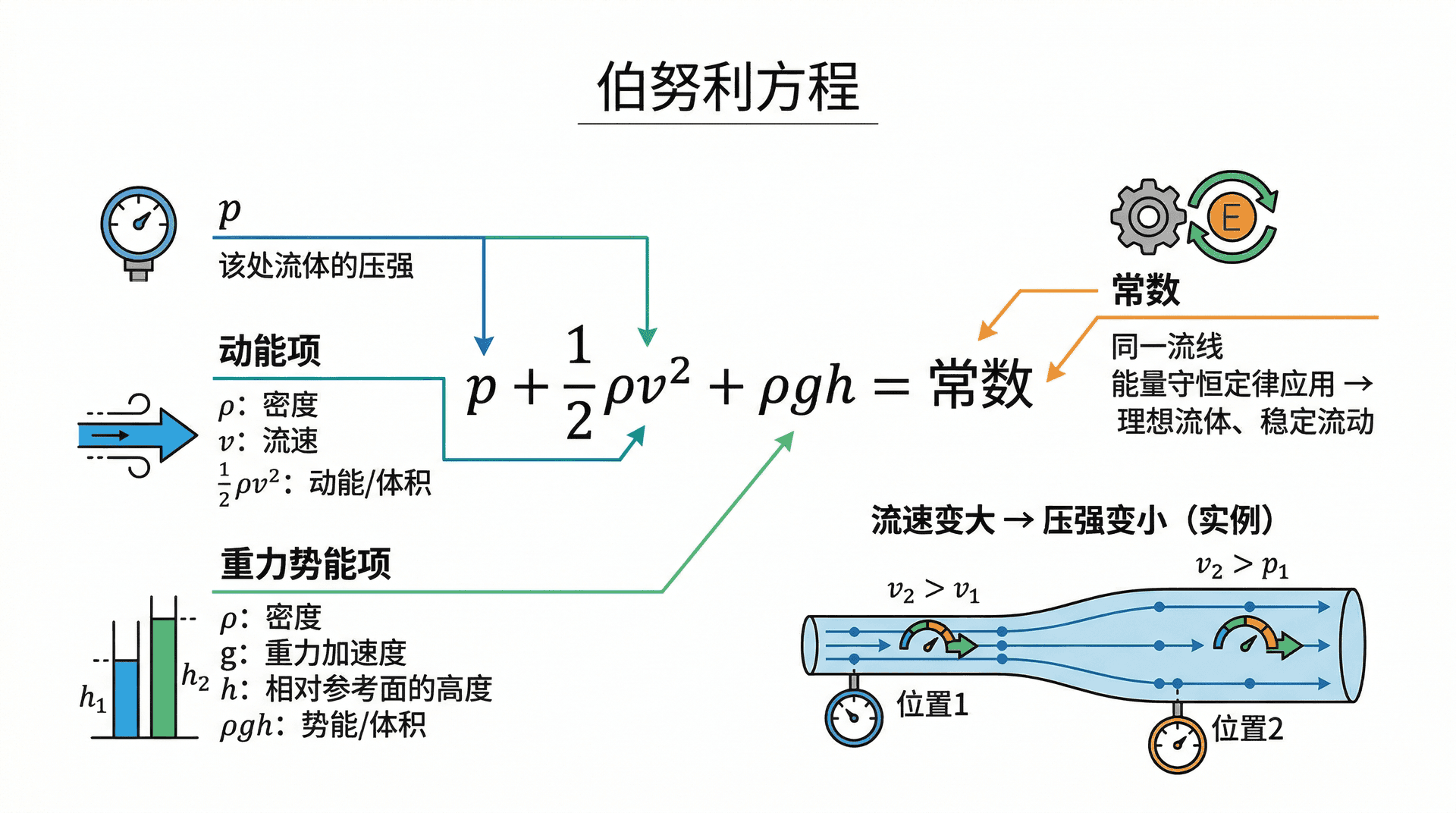 伯努利方程本质上是流体的能量守恒定律: 代表单位体积流体的动能, 代表单位体积流体的重力势能, 代表压强势能(流体做功的能力)。三者之和沿流线保持不变。