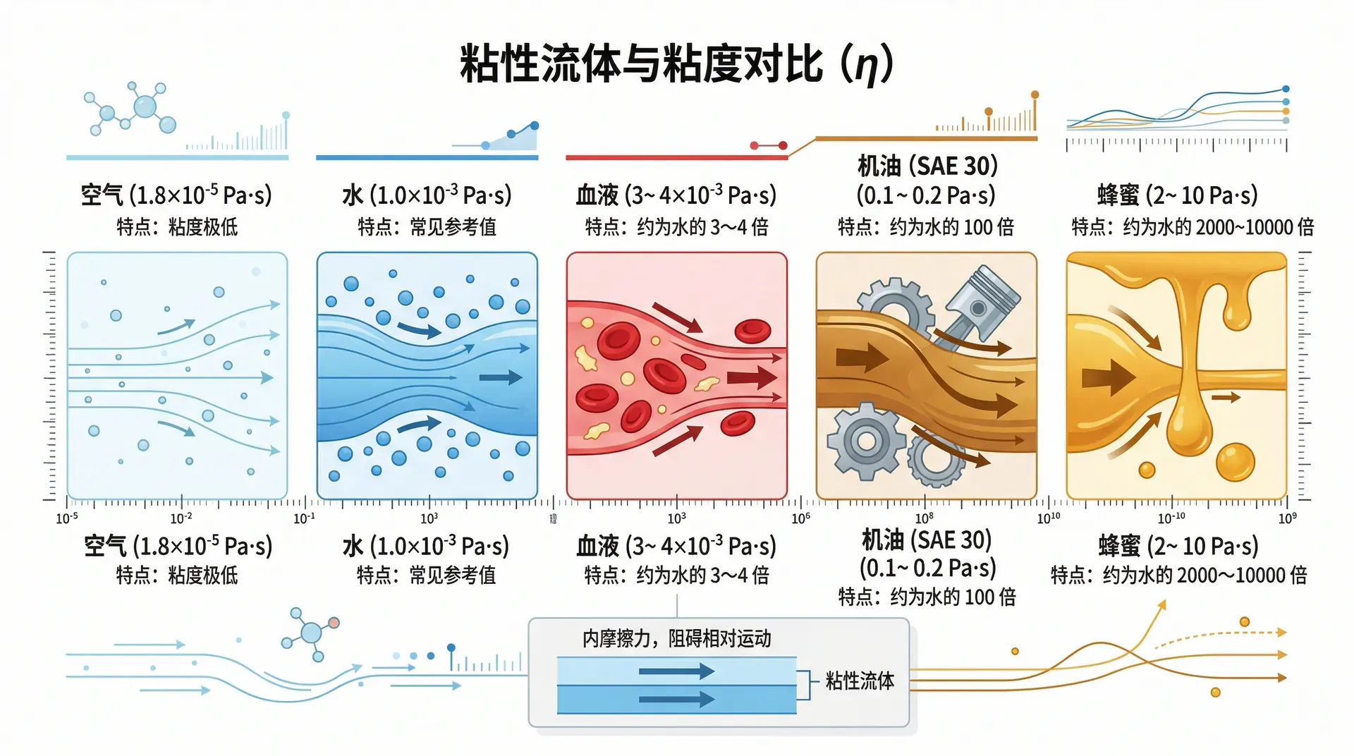 前面讨论的都是理想流体,实际流体都有粘性——流体内部相邻流层之间存在内摩擦力,阻碍相对运动。粘性用动力粘度 表示,单位为 Pa·s。