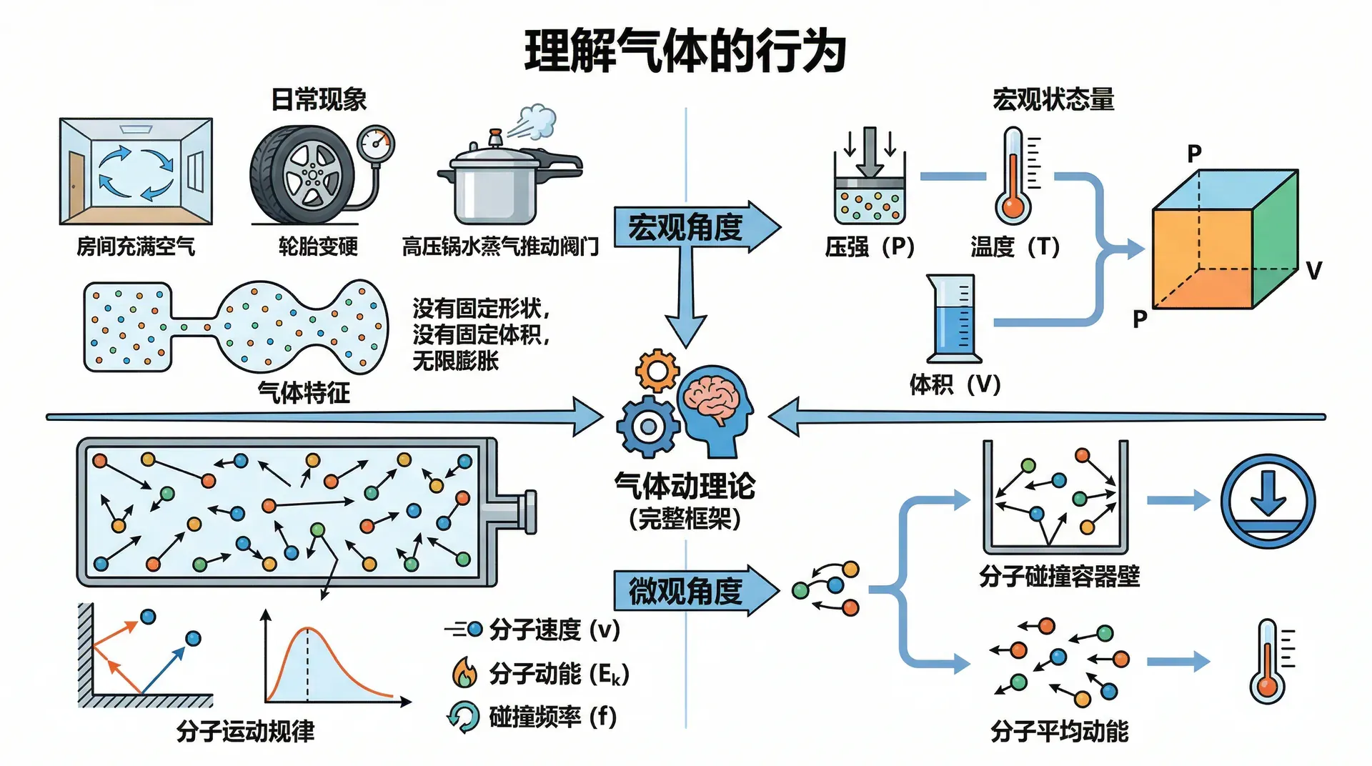 理解气体的行为,需要从两个角度入手:一是宏观角度,研究气体的压强、温度和体积之间的关系;二是微观角度,探究气体分子的运动规律。这两个角度相互补充,共同构成气体动理论的完整框架。