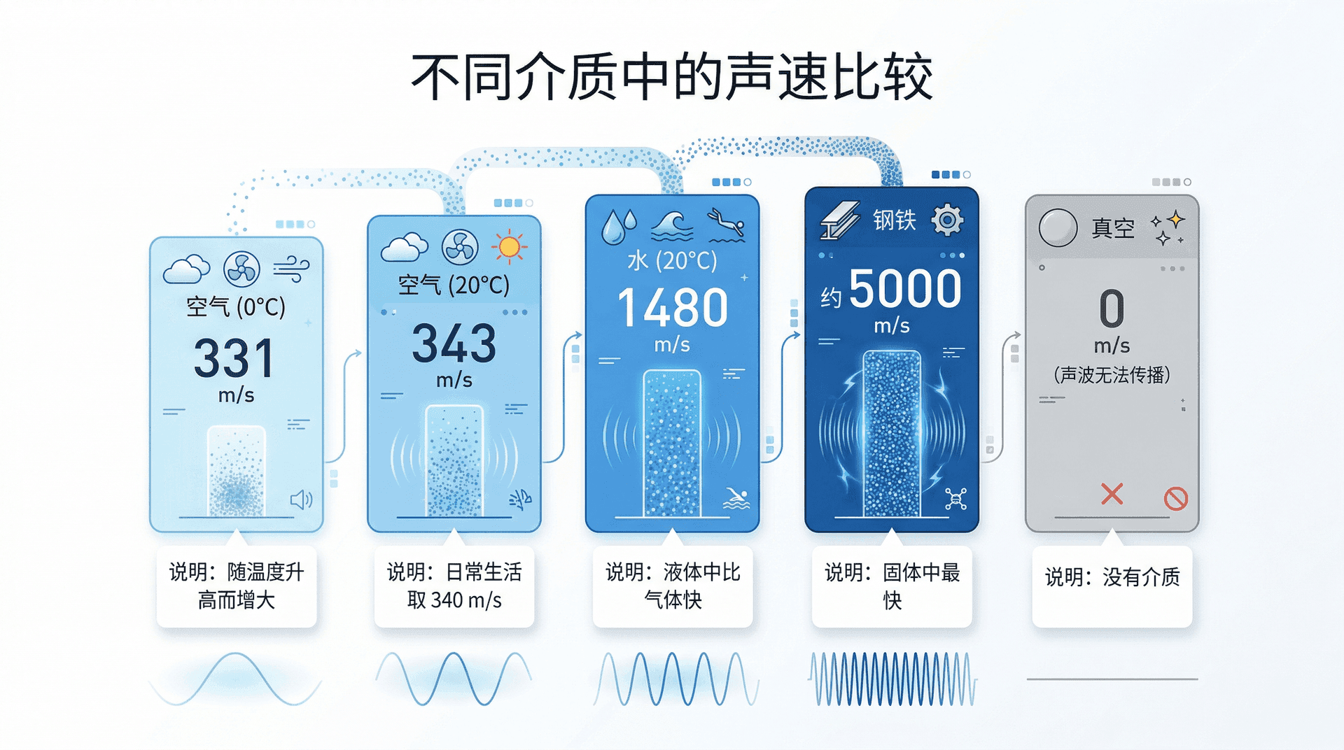 波速由传播介质的性质决定,与波源的振动频率无关。同一种介质中,介质的弹性越强、密度越小,波速越大;温度升高时,气体中的声速也会增大。
