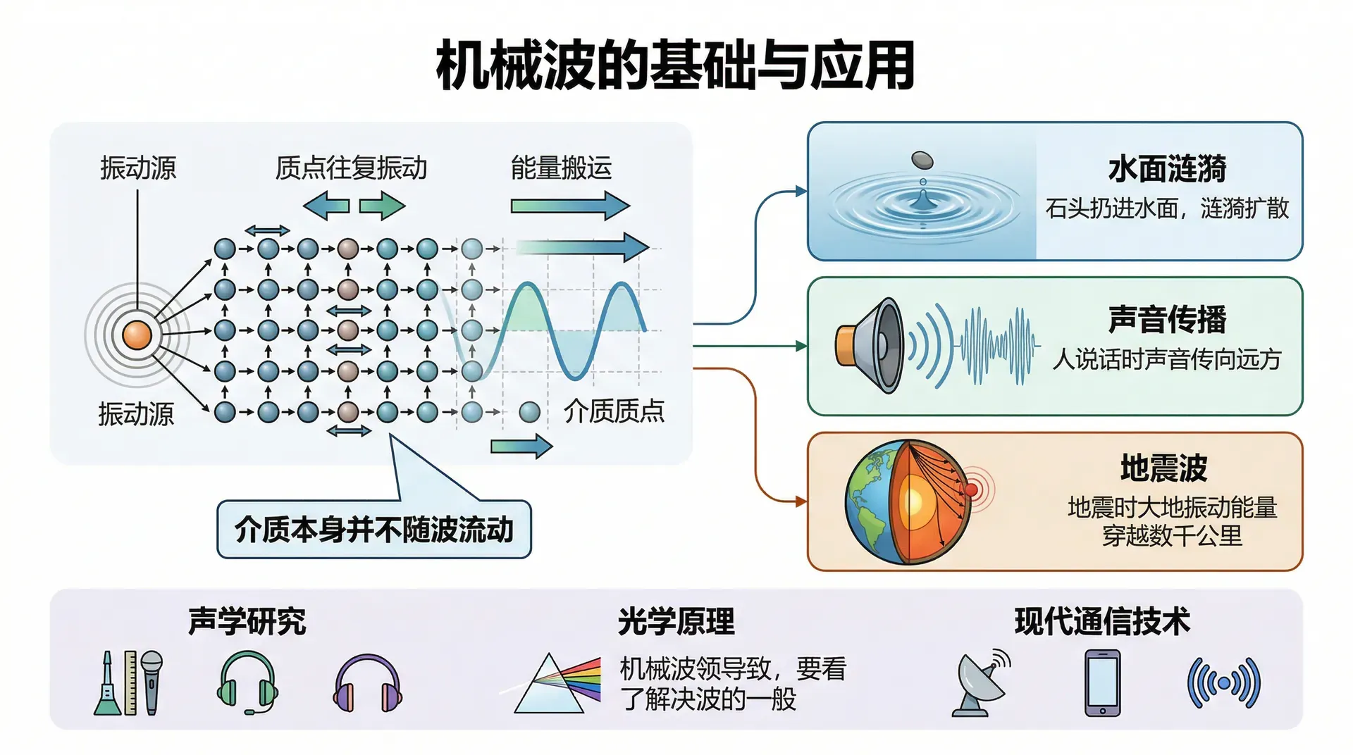 石头扔进平静的水面,一圈圈涟漪向四周扩散;人说话时声音传向远方;地震时大地振动能量穿越数千公里……这些现象背后的共同本质,就是机械波。波是振动在介质中的传播,它把能量从一个地方搬运到另一个地方,而介质本身并不随波流动。理解机械波,是掌握声学、光学乃至现代通信技术的重要出发点。