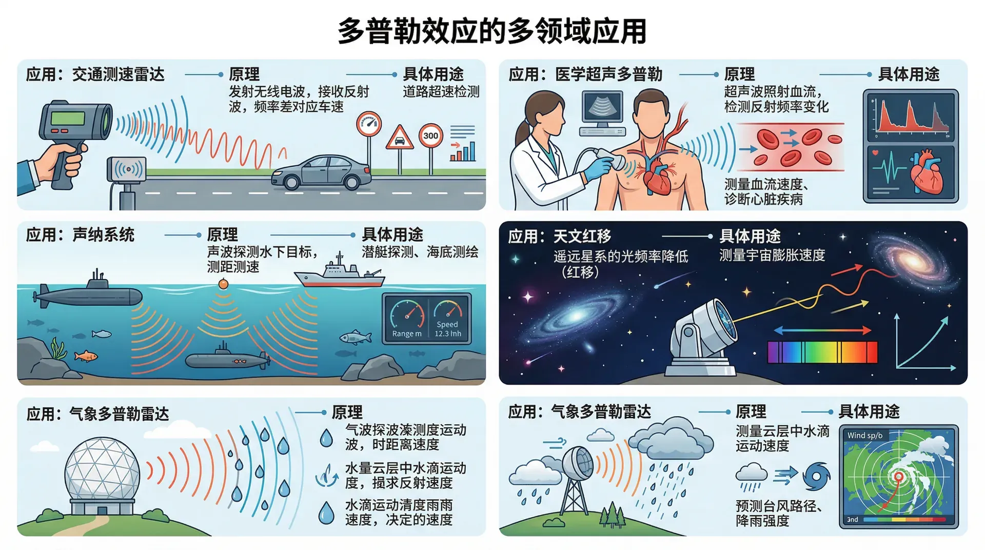 天文学中观测到遥远星系的光谱向红端(低频端)移动,称为“红移”。这正是多普勒效应的体现——星系正在远离地球,接收到的光频率低于原来发出时的频率。哈勃正是通过分析红移数据,发现了宇宙正在膨胀这一重大结论。