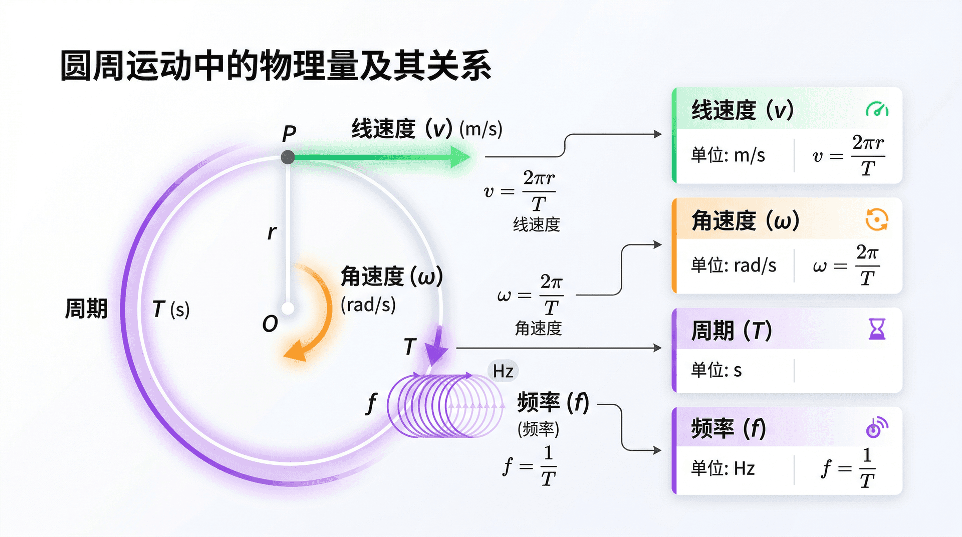 线速度 v:物体在圆弧上单位时间内走过的弧长,单位 m/s。