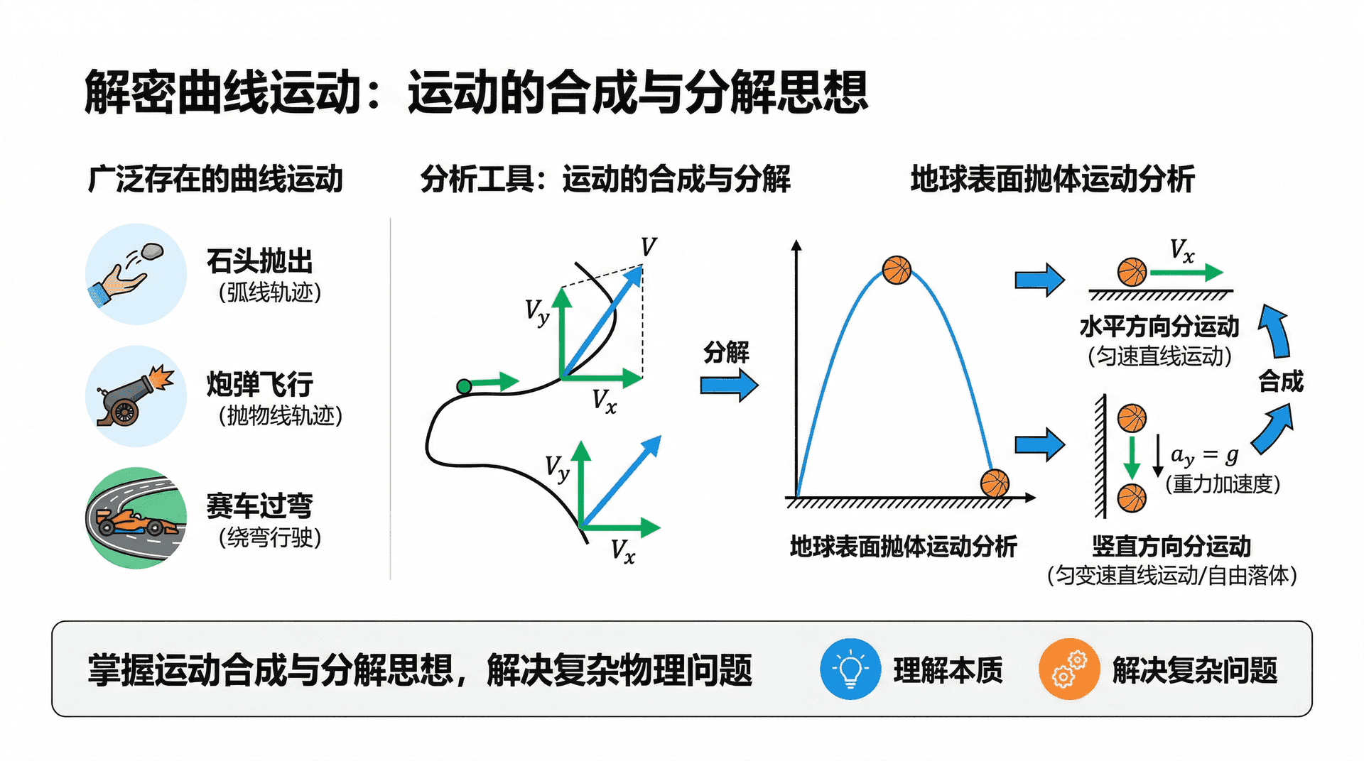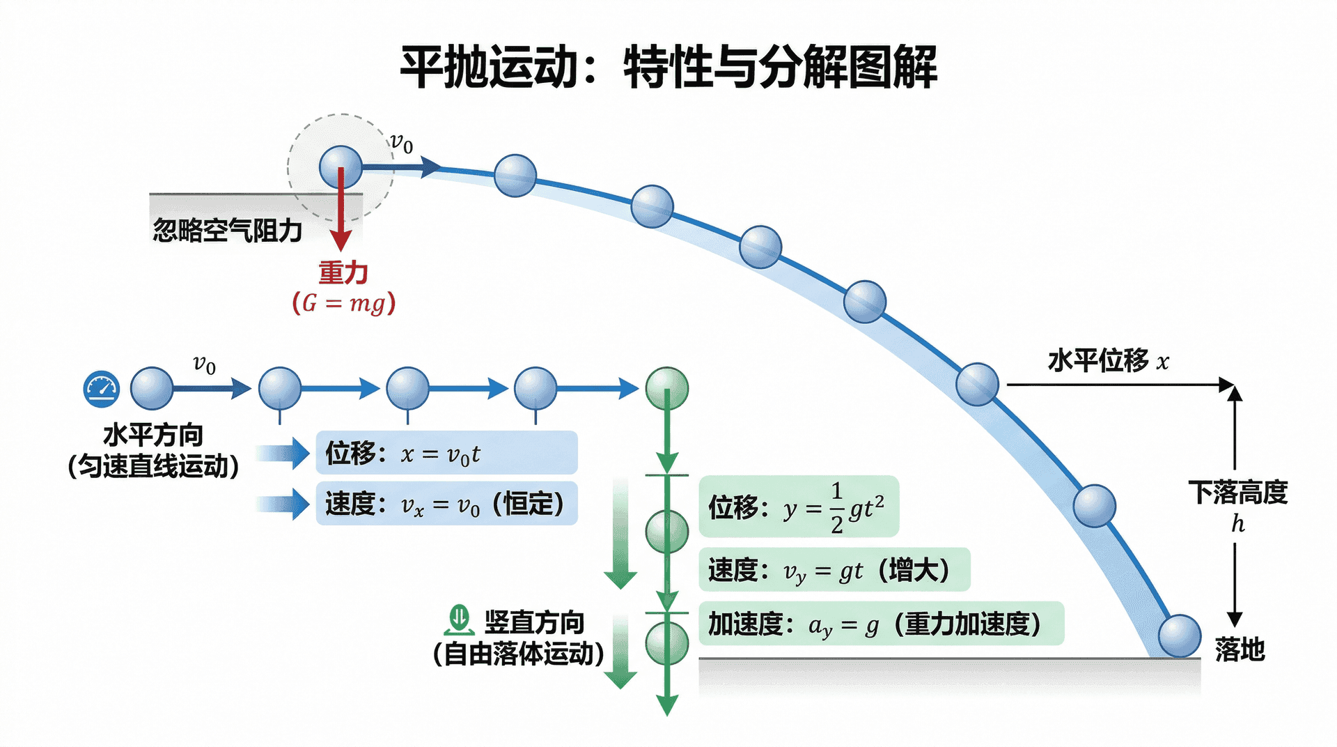 平抛运动是最典型的曲线运动之一。物体以水平初速度 v0 抛出,此后只受重力作用(忽略空气阻力),在水平方向做匀速运动,在竖直方向做自由落体运动。