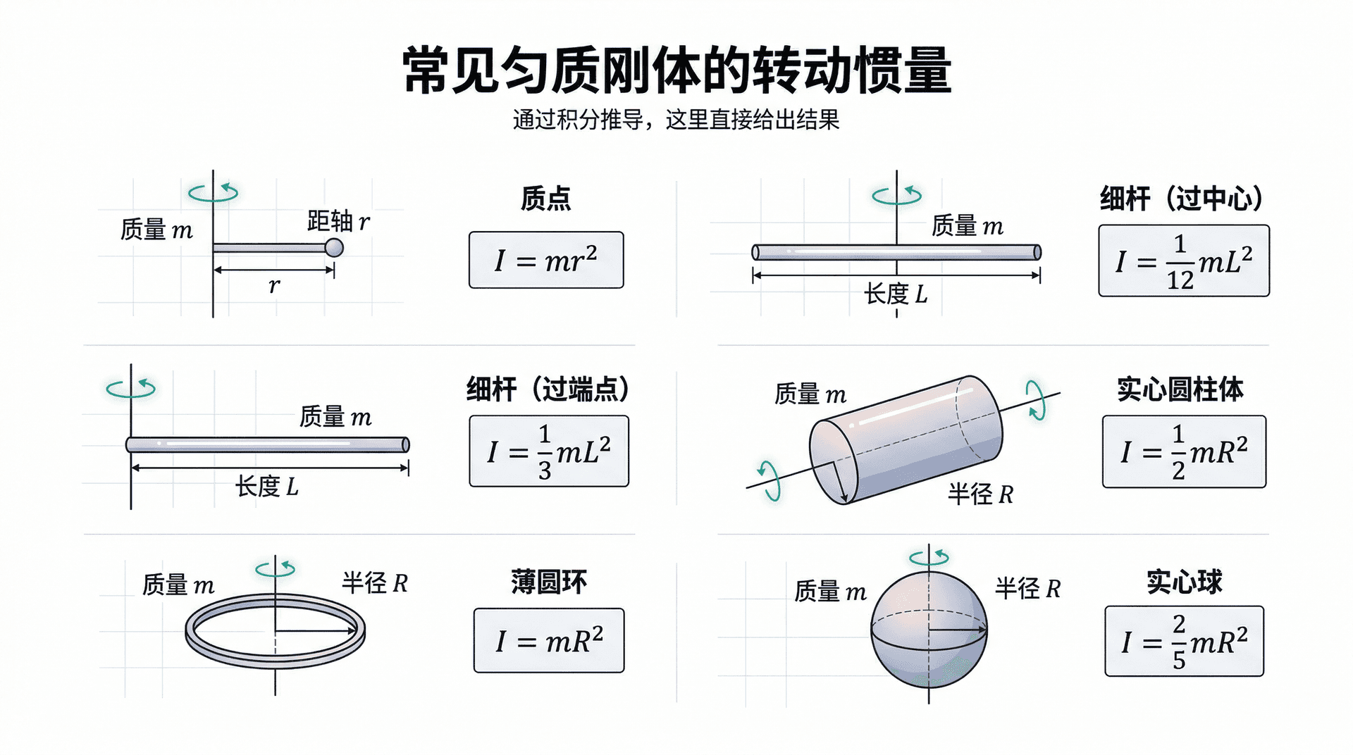 常见匀质刚体的转动惯量(通过积分推导,这里直接给出结果):